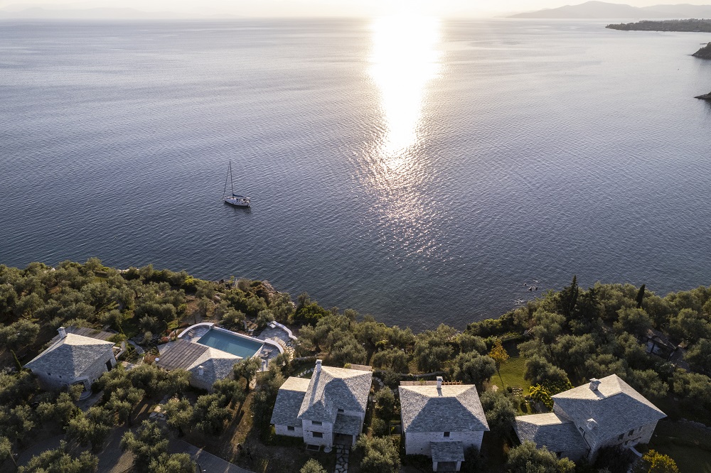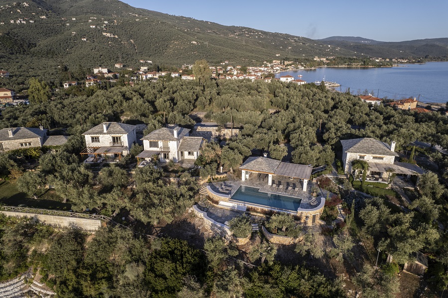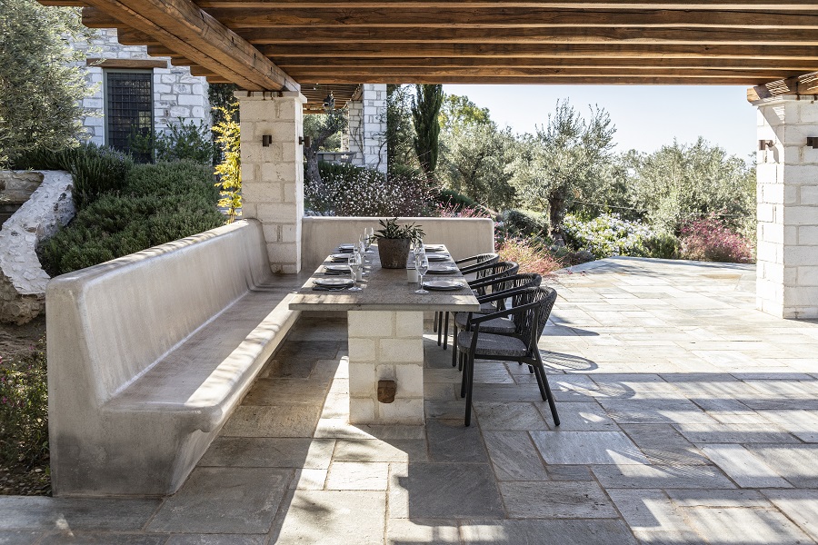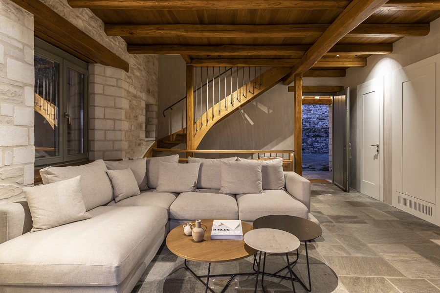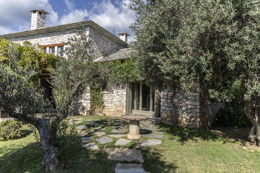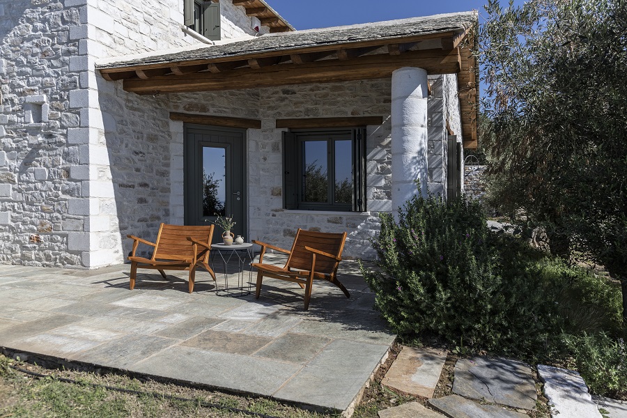 Οι συμπαγείς πέτρινοι όγκοι των κτιρίων με τους σκιασμένους χώρους κάτω από τις πέργκολες, διατηρούν μία δική τους εσωτερικότητα με το ανοιχτό αίθριο και την εμφανή παραδοσιακή στέγη από πλάκα Πηλίου και καστανιές. Τα κονιάματα από κουρασάνι και τα μασίφ ξύλα επιβεβαιώνουν την χρήση των φυσικών υλικών ως μοναδική επιλογή σ’ έναν τόπο συνδεδεμένο τόσο αρμονικά με το περιβάλλον.
