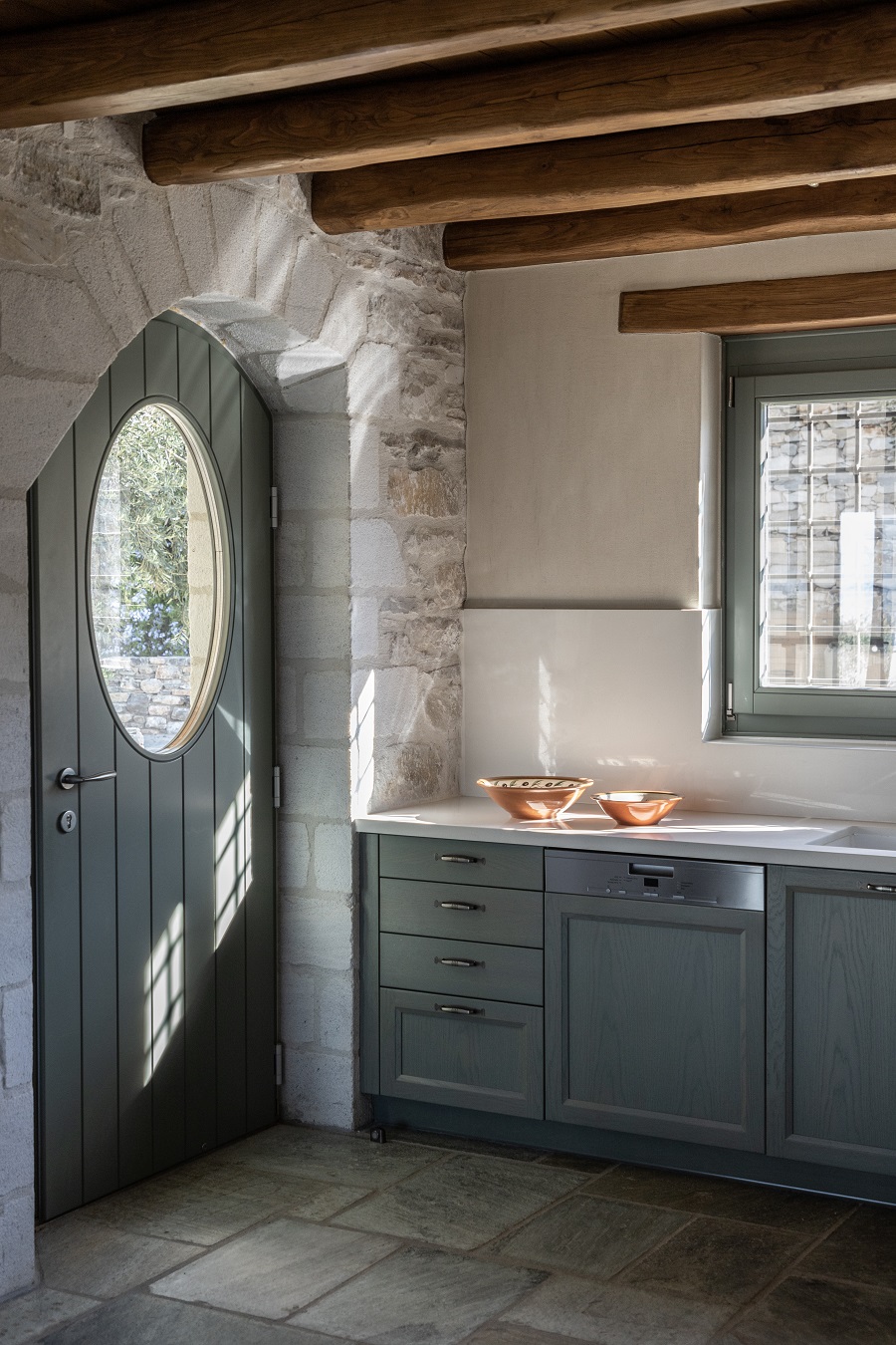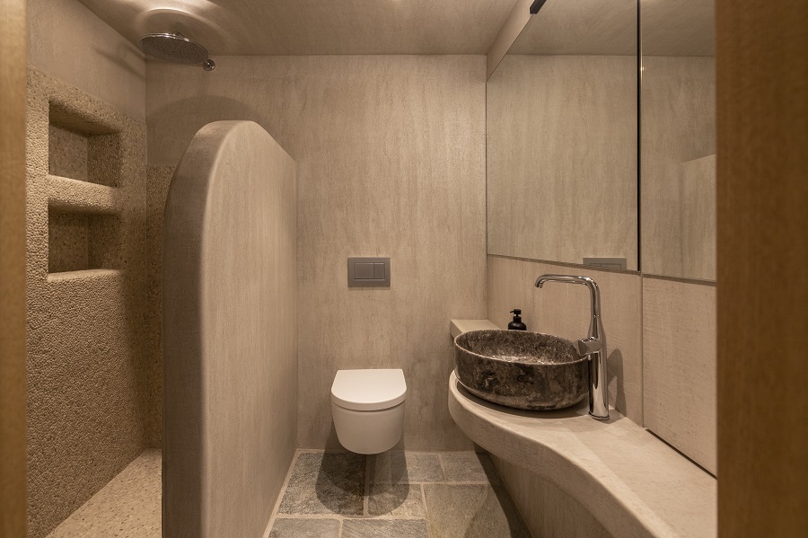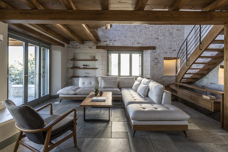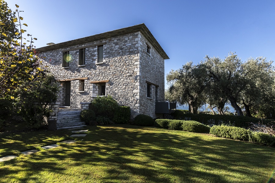 Οι συμπαγείς πέτρινοι όγκοι των κτιρίων με τους σκιασμένους χώρους κάτω από τις πέργκολες, διατηρούν μία δική τους εσωτερικότητα με το ανοιχτό αίθριο και την εμφανή παραδοσιακή στέγη από πλάκα Πηλίου και καστανιές. Τα κονιάματα από κουρασάνι και τα μασίφ ξύλα επιβεβαιώνουν την χρήση των φυσικών υλικών ως μοναδική επιλογή σ’ έναν τόπο συνδεδεμένο τόσο αρμονικά με το περιβάλλον.