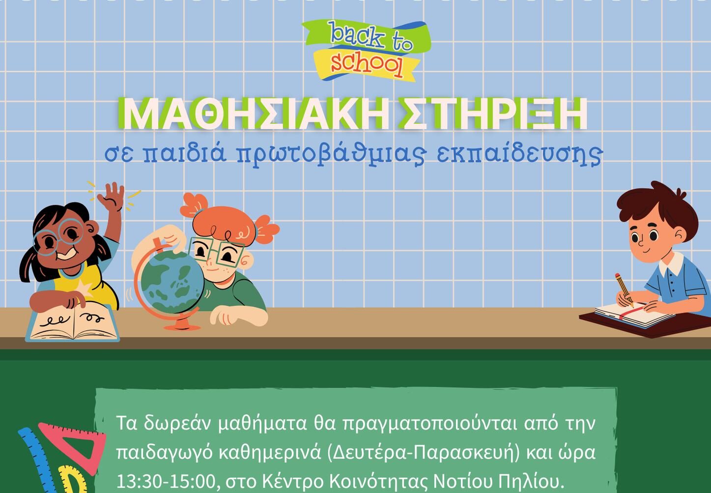 Το Κέντρο Κοινότητας του Δήμου Νοτίου Πηλίου προγραμματίζει, για τρίτη συνεχόμενη χρονιά, δράση μαθησιακής στήριξης παιδιών Πρωτοβάθμιας Εκπαίδευσης ενόψει της έναρξης της νέας σχολικής χρονιάς με σκοπό την υποστήριξη των παιδιών που αντιμετωπίζουν δυσκολίες στην καθημερινή τους μελέτη.
