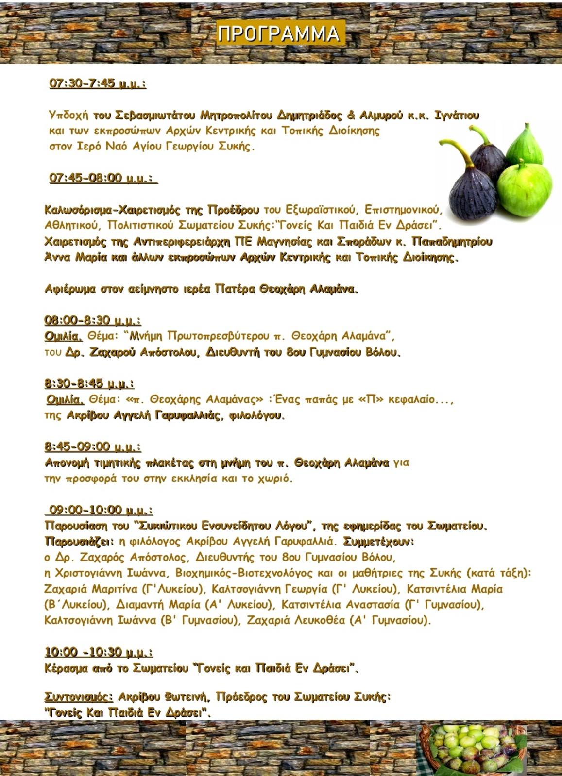 Το Εξωραϊστικό, Αθλητικό, Επιστημονικό και Πολιτιστικό Σωματείο Συκής «Γονείς και Παιδιά εν δράσει» διοργανώνουν την 3η γιορτή Πέτρας και Σύκου το Σάββατο 16 Αυγούστου από τις 7:30μ.μ. στον Ιερό Ναό Αγίου Γεωργίου Συκής, νοτίου Πηλίου.
