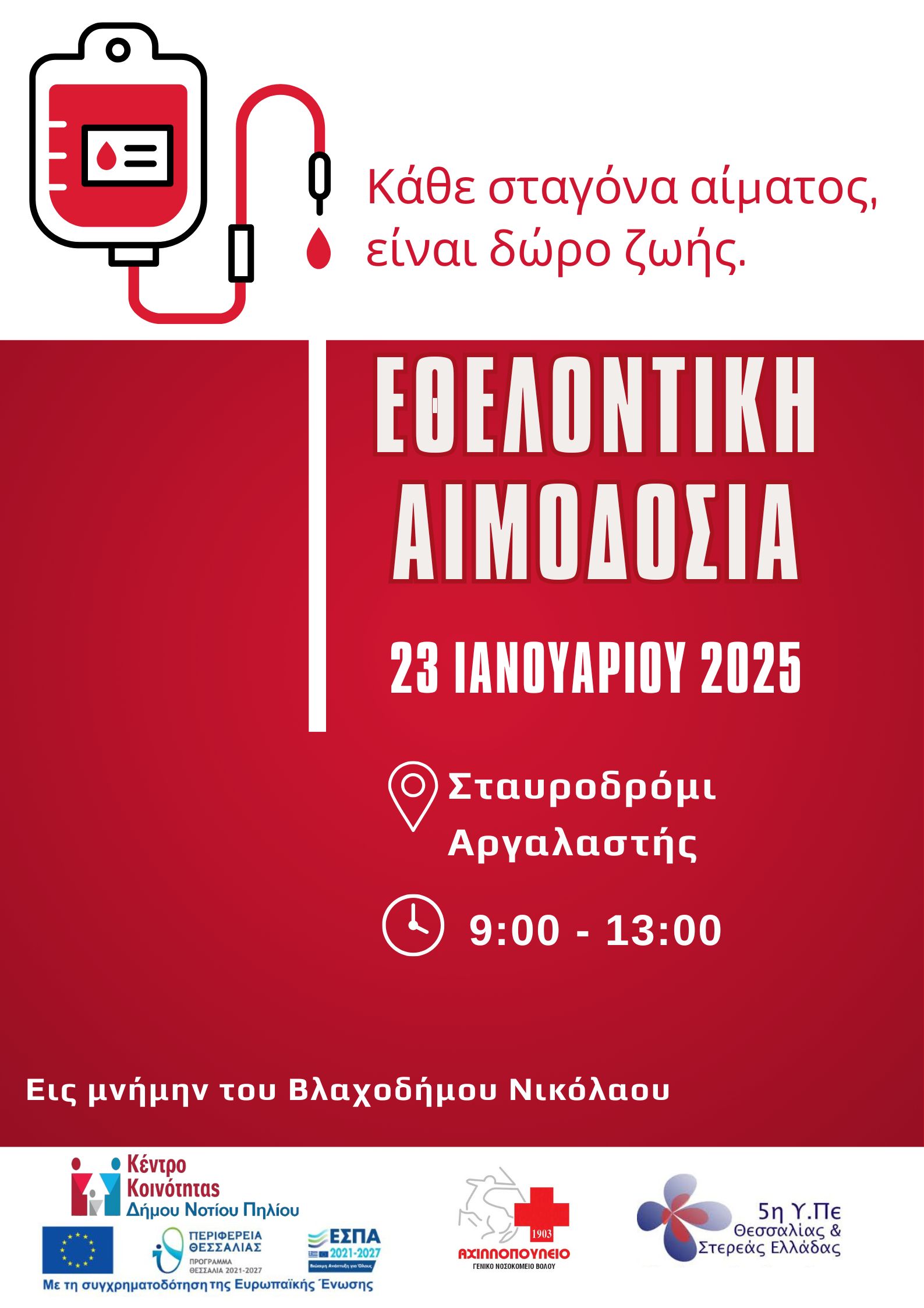 Το Κέντρο Κοινότητας Δήμου Νοτίου Πηλίου, σε συνεργασία με το Κέντρο Υγείας Αργαλαστής και τη Μονάδα Αιμοδοσίας του Γενικού Νοσοκομείου Βόλου, διοργανώνει δράση εθελοντικής αιμοδοσίας με σεβασμό στη μνήμη του Νικόλαου Βλαχοδήμου, που έχασε πρόσφατα τη ζωή του.