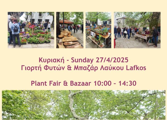 Αυτή την Κυριακή 27 Απριλίου από τις 10 το πρωί ως τις 14:30 θα πραγματοποιηθεί στον Λαύκο γιορτή φυτών και bazaar. Η εκδήλωση γίνεται με την υποστήριξη του Πολιτιστικού Συλλόγου Λαύκου «Δράση», του Περιπατητικού Συλλόγου «Φίλοι των Καλντεριμιών Ν. Πηλίου», της Ζωοφιλικής Αδεσπότων Πηλίου, του «Give Strays a Chance» και του “Mediterranean Garden Society Πήλιο και Σποράδες».
