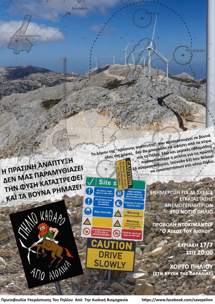 Η εκδήλωση θα γίνει την Κυριακή 17 Ιουλίου, στις 8 το απόγευμα στην πλατεία του Χόρτου Πηλίου, στην βρύση της παραλίας, στη διάρκεια της οποίας θα γίνει ενημέρωση για τα σχέδια εγκατάστασης ανεμογεννητριών στο Νότιο Πήλιο και προβολή του ντοκιμαντέρ “Ο Ασκός του Αιόλου”.