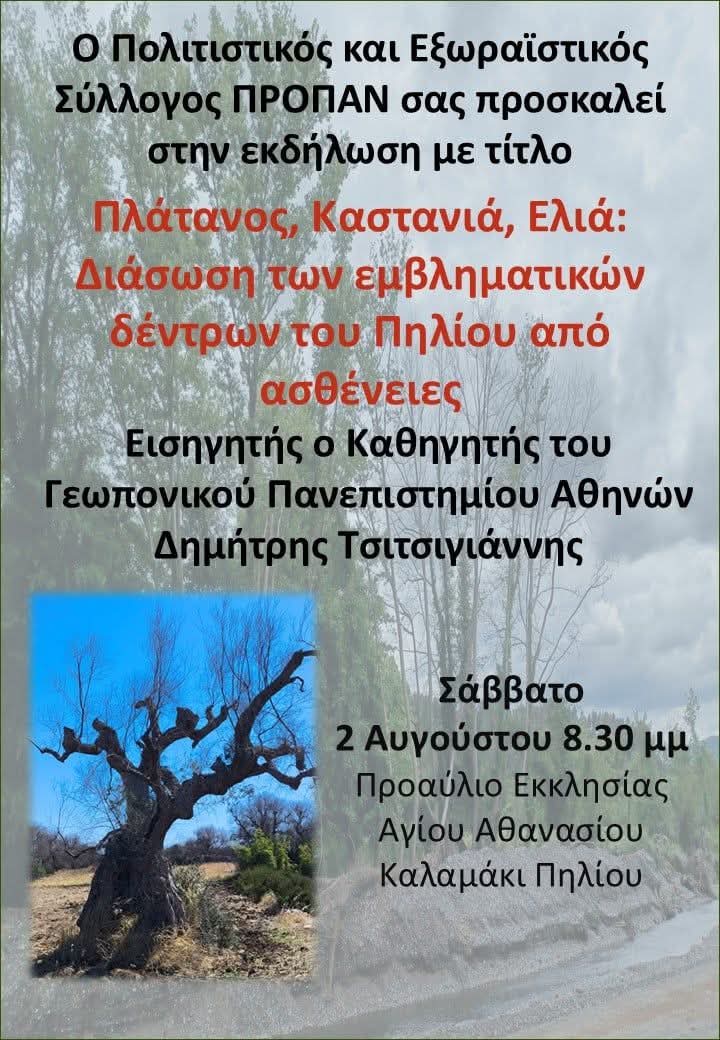 Ο Πολιτιστικός και Εξωραϊστικός Σύλλογος ΠΡΟΠΑΝ πραγματοποιεί εκδήλωση με τίτλο «Πλάτανος, Καστανιά, Ελιά: Διάσωση των εμβληματικών δέντρων του Πηλίου από ασθένειες» το Σάββατο 2 Αυγούστου στις 20:30 στο προαύλιο του Ιερού Ναού Αγίου Αθανασίου στο Καλαμάκι Πηλίου. Εισηγητής θα είναι ο Καθηγητής του Γεωπονικού Πανεπιστημίου Αθηνών Δημήτρης Τσιτσιγιάννης.