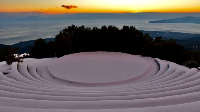 Μοναδικής ομορφιάς τοπίο, ούτως ή άλλως στο Θέατρο «Αλώνι», πόσο μάλλον με τις … πινελιές του χιονιού των τελευταίων ωρών. Είναι ουσιαστικά, ό,τι δημιούργησε χθες, ο … «αόρατος σκηνοθέτης» σε ένα σημείο, μυσταγωγικό, στην «Μικρή Επίδαυρο του Πηλίου» . Η εικόνα και μόνο, δημιουργεί πλήθος σκέψεων σήμερα, αλλά και προγραμματισμού … εκδηλώσεων για το αύριο, όπως του ερχόμενου καλοκαιριού, που δεν θα αργήσει να … καταφθάσει , χαρίζοντάς μας βραδιές στις οποίες θα αποζητούμε τη δροσιά του βουνού, αλλά και τις πολιτιστικές προτάσεις του αεικίνητου καλλιτέχνη και ιδρυτή του θεάτρου, Γιώργου Τριανταφύλλου.
