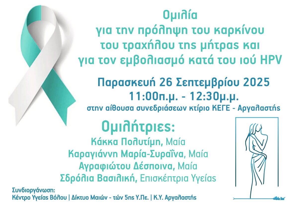 Τις δυνάμεις τους ενώνουν το Κέντρο Υγείας Βόλου, το Δίκτυο Μαιών της 5ης ΥΠΕ και το Κέντρο Υγείας Αργαλαστής και στο πλαίσιο δράσεων Αγωγής Υγείας στην κοινότητα πραγματοποιούν ενημερωτική ομιλία την Παρασκευή 26 Σεπτεμβρίου από τις 11 το πρωί ως τις 12:30. στην αίθουσα συνεδριάσεων κτίριο ΚΕΓΕ Αργαλαστής για την πρόληψη του καρκίνου του τραχήλου της µήτρας και για τον εµβολιασµό κατά του ιού HPV.
