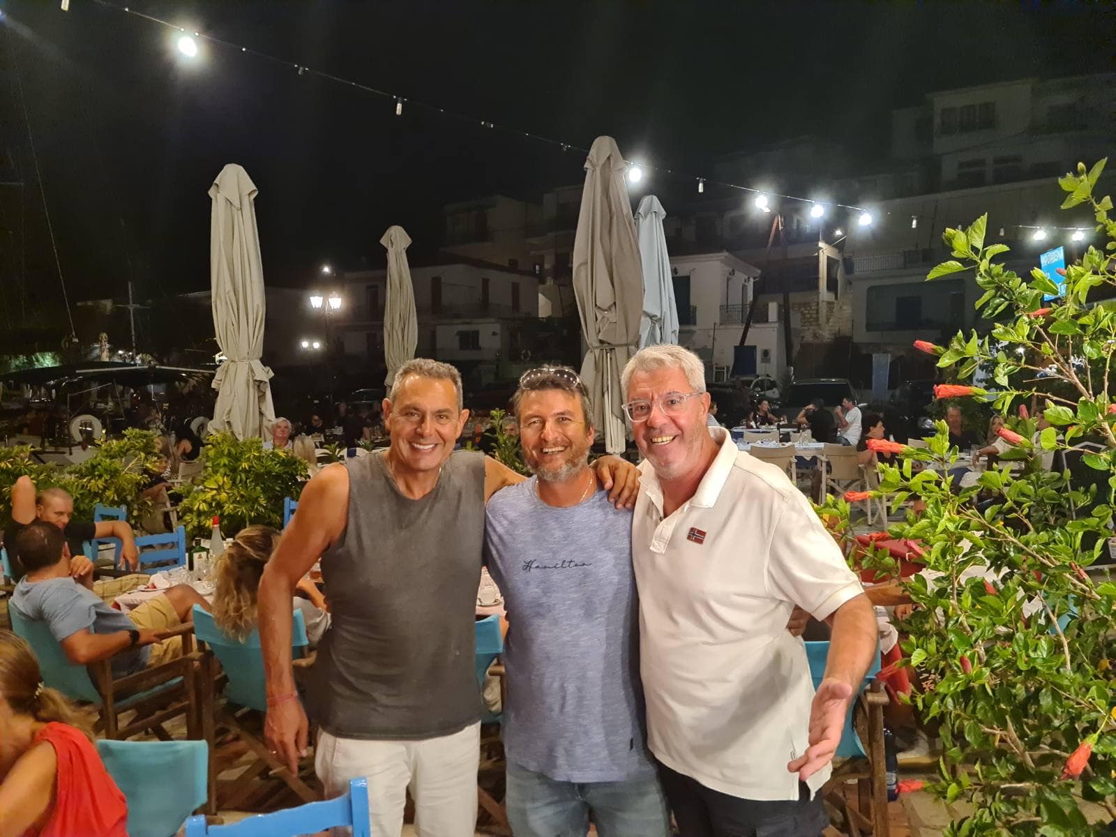 Οι δύο άνδρες με χαλαρή και καλοκαιρινή διάθεση φωτογραφήθηκαν με τον ιδιοκτήτη της ταβέρνας, Μανώλη Γιαμαρέλο.