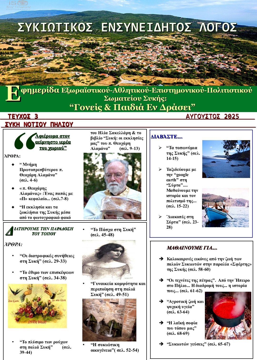Συνεχίζοντας η πρόεδρος αναφέρει: “Μεριμνώντας πάντοτε για την πρόοδο και την προκοπή της νέας γενιάς αισθανόμαστε βαθύ το χρέος για την εξοικείωσή της με το παρελθόν και την ιστορία του χωριού, γιατί η γνώση των ηθών και των εθίμων του τόπου μας, σε μια εποχή που οι πολιτιστικές αλληλεπιδράσεις πολλαπλασιάζονται, μπορεί να λειτουργήσει ως αντίβαρο στον κίνδυνο πολιτιστικής αλλοτρίωσης. Το φετινό τεύχος είναι αφιερωμένο στον ιερέα που επί πολλά χρόνια υπηρέτησε με ζήλο την εκκλησία του χωριού και που με τον χαρακτήρα του, την ισχυρή προσωπικότητά του και με το έργο του, δίδαξε την αρετή και τη σύνεση, την αξία της πίστης στα διδάγματα της εκκλησίας και στο Λόγο του Θεού και στάθηκε πάντα πολύτιμος αρωγός του τόπου, αφήνοντας αξέχαστη την μνήμη του στις επερχόμενες γενιές, τον πατέρα Θεοχάρη Αλαμάνα”.