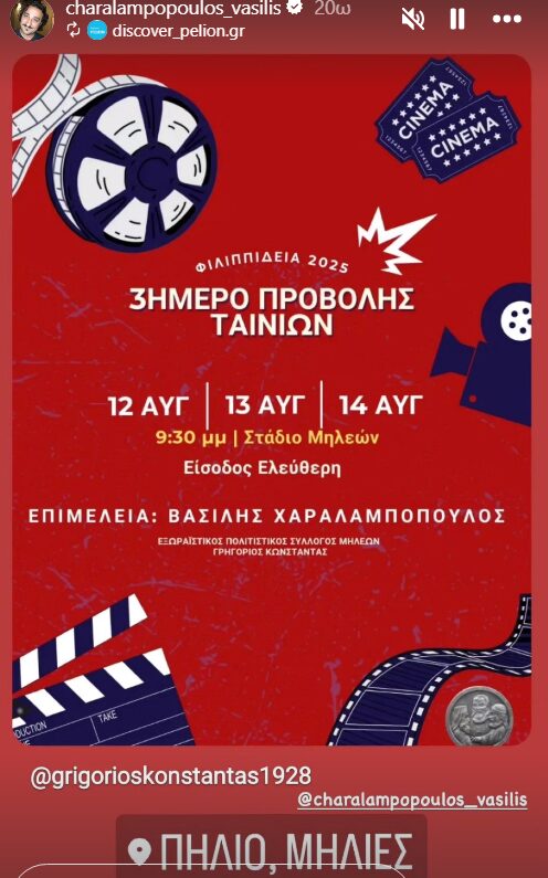 Στο πλαίσιο αυτό, έχε ξεκινήσει τριήμερο προβολής ταινιών, όπου την επιμέλεια έχει ο γνωστός και αγαπημένος ηθοποιός Βασίλης Χαραλαμπόπουλος, ο οποίος διατηρεί σπίτι στις Μηλιές. Με τη στάση του αλλά και τη δράση του ο Βασίλης Χαραλαμπόπουλος δείχνει έμπρακτα την αγάπη του για τις Μηλιές και το Πήλιο, καθώς αποτελεί ένα ζωντανό κύτταρο της τοπικής ζωής.