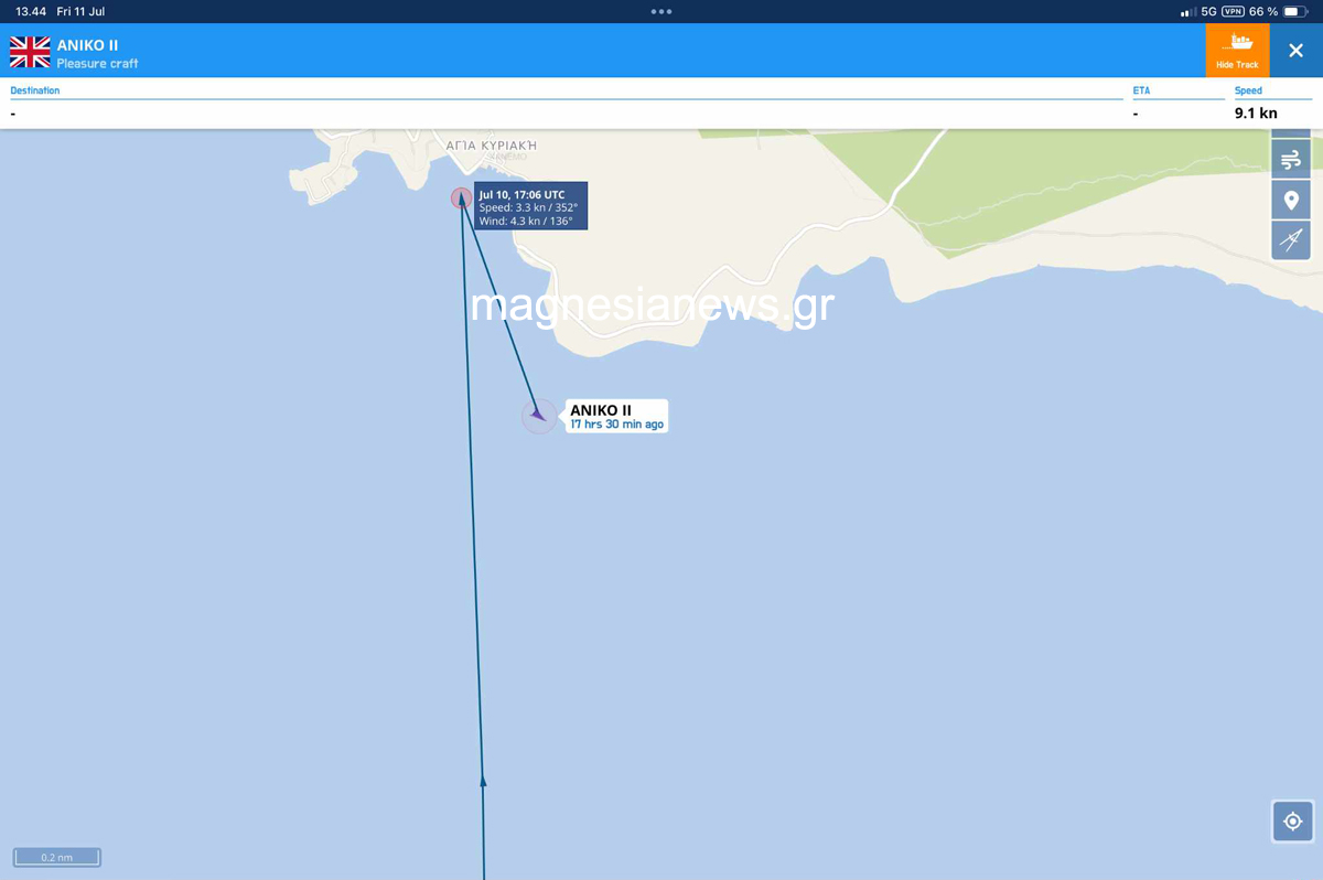 Την πρόθεσή του να κινηθεί νομικά, τόσο ο ίδιος όσο και ιδιοκτήτες των σκαφών που υπέστησαν ζημιές, κατά του καπετάνιου του σκάφους που αναστάτωσε προχθές το απόγευμα το ήσυχο λιμανάκι της Αγίας Κυριακής, δηλώνει στο magnesianews.gr ο επιχειρηματίας Μανώλης Γιαμαρέλος. Ιδιοκτήτης της γνωστής ψαροταβέρνας “Ο Μανώλας”, ο κ. Γιαμαρέλος ήταν αυτόπτης μάρτυρας του περιστατικού που θα μπορούσε να έχει χειρότερα αποτελέσματα, τόσο σε υλικές ζημιές, όσο και σε τραυματισμούς επιβατών ιστιοπλοϊκών σκαφών που βρίσκονταν στο σημείο, όταν το 35μετρο super yacht με όνομα “Aniko II” πλησίασε τόσο κοντά το λιμάνι με ταχύτητα περίπου 30 κόμβους και σταμάτησε μόλις 100 μέτρα από την ακτή, προκαλώντας μεγάλους κυματισμούς με αποτέλεσμα τα σκάφη που είχαν αράξει στο λιμανάκι για να απολαύσουν οι επιβάτες τους φρέσκα ψάρια και το υπέροχο ηλιοβασίλεμα, να συγκρουστούν μεταξύ τους. Μιλώντας στο magnesianews.gr, ο κ. Γιαμαρέλος περιγράφει με μια σχετική ένταση το πως συνέβη το περιστατικό, κάνοντας λόγο για άγνοια από πλευράς του καπετάνιου για το τι θα μπορούσε να προκαλέσει με την επιπόλαιη συμπεριφορά του. Ο καπετάνιος φαίνεται να αντιλήφθηκε έστω και την τελευταία στιγμή τον πανικό προκάλεσε στο λιμανάκι της Αγίας Κυριακής και έσπευσε να απομακρυνθεί κατευθυνόμενος προς της Σκιάθο, όπως φαίνεται και στο σύστημα καταγραφής του πλου των σκαφών, που απεικονίζεται παρακάτω.