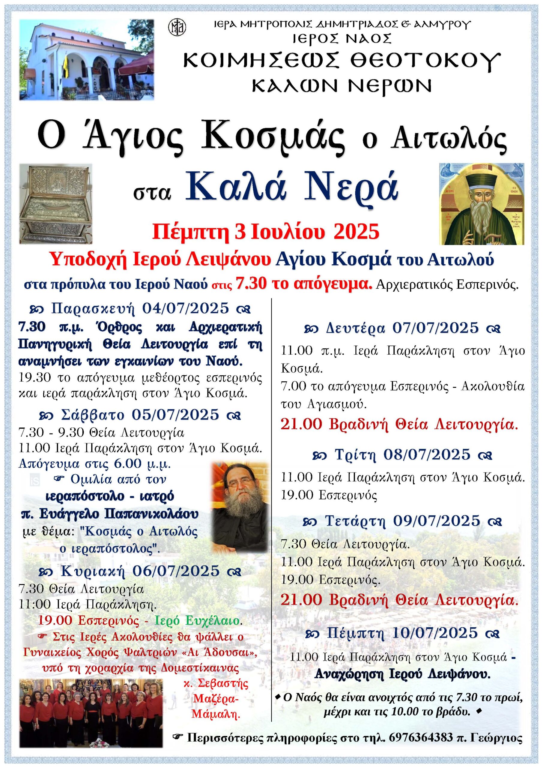 α) η επίκαιρη ομιλία με θέμα: “Κοσμάς ο Αιτωλός ο ιεραπόστολος”, από τον ιεραπόστολο – ιατρό π. Ευάγγελο Παπανικολάου το Σάββατο 5 Ιουλίου 2025 στις 6.00 μ.μ.