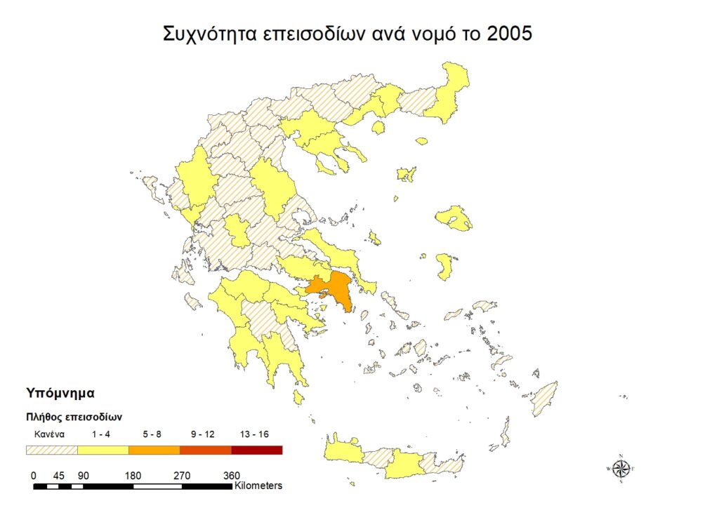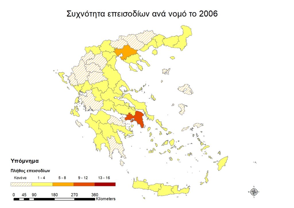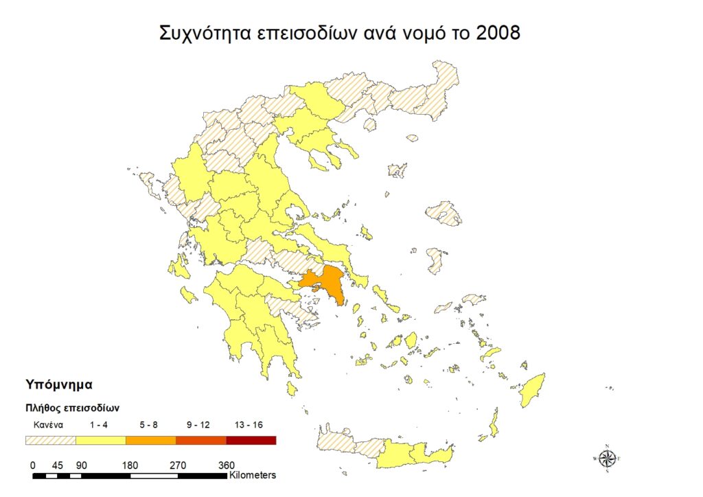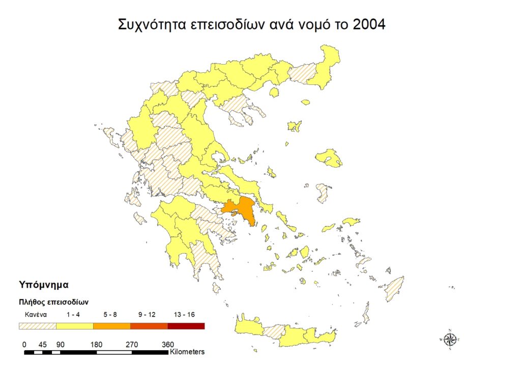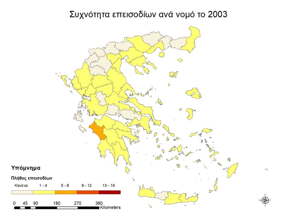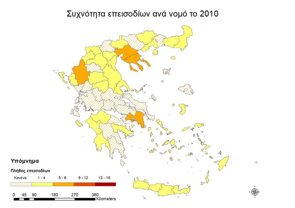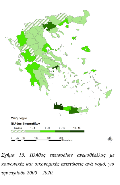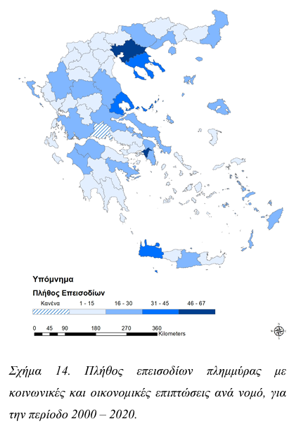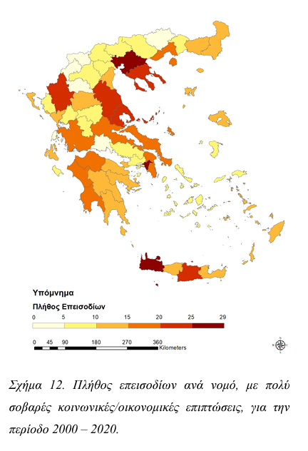 Στο χάρτη του Σχήµατος 12 παρατηρείται η γεωγραφική κατανοµή των επεισοδίων µε ένταση επιπτώσεων επιπέδου 3. Στην Αττική αθροιστικά καταγράφτηκαν 76 επεισόδια µε πολύ σοβαρές κοινωνικές/οικονοµικές επιπτώσεις κατά την εικοσαετία, ενώ ακολουθούν οι νοµοί της Θεσσαλονίκης, Χανίων, Μαγνησίας Χαλκιδικής, Ιωαννίνων, Ηρακλείου, και Λάρισας µε 20 – 30 ο καθένας.