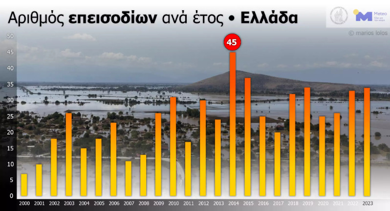 Συνολικά καιρικά επεισόδια με κοινωνικο-οικονομικές επιπτώσεις: Την 1η 12-ετία καταγράφηκαν συνολικά 215 επεισόδια (~18 κατά μέσο όρο ετησίως) και την 2η 12-ετία καταγράφηκαν 365 επεισόδια (~30 κατά μέσο όρο ετησίως). Επομένως, το 2ο μισό της περιόδου 2000-2023 είχαμε 70% αύξηση στα καιρικά επεισόδια σε σχέση με το 1ο μισό της περιόδου.