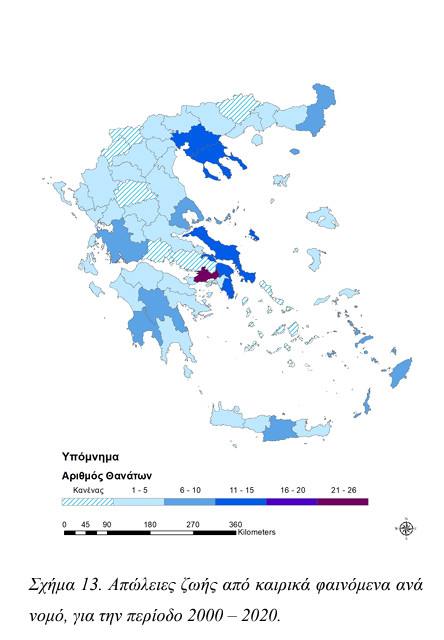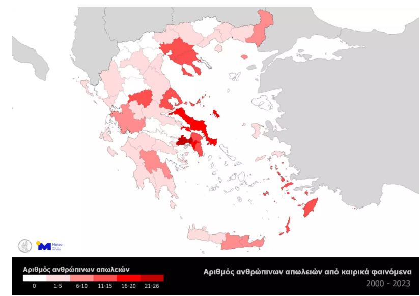 Στην Ελλάδα, από το 2000 έως σήμερα, καταγράφηκαν 580 καιρικά επεισόδια με αρνητικές κοινωνικο-οικονομικές επιπτώσεις και 285 ανθρώπινες απώλειες από διάφορα φαινόμενα (κυρίως πλημμύρες, κεραυνούς, ανεμοθύελλες).