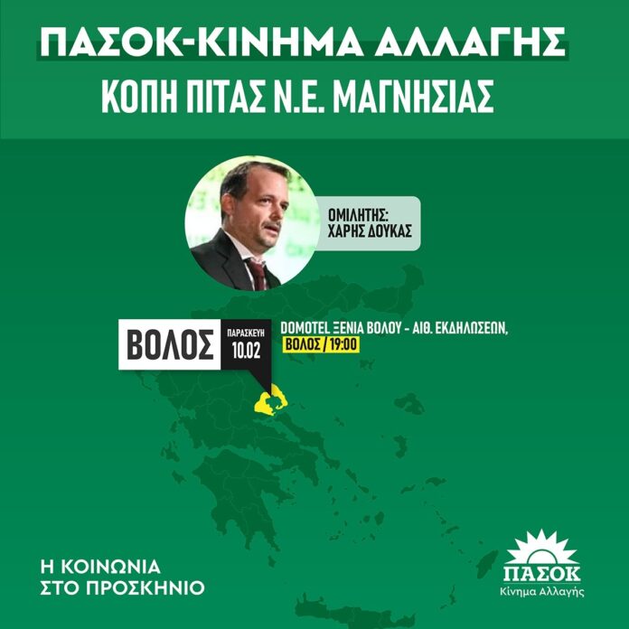 Η Νομαρχιακή Επιτροπή Μαγνησίας του ΠΑΣΟΚ – Κινήματος Αλλαγής προσκαλεί στην εκδήλωση κοπής πίτας που θα πραγματοποιηθεί στο Domotel Xenia Volos την Παρασκευή 10 Φεβρουαρίου και ώρα 19:00.