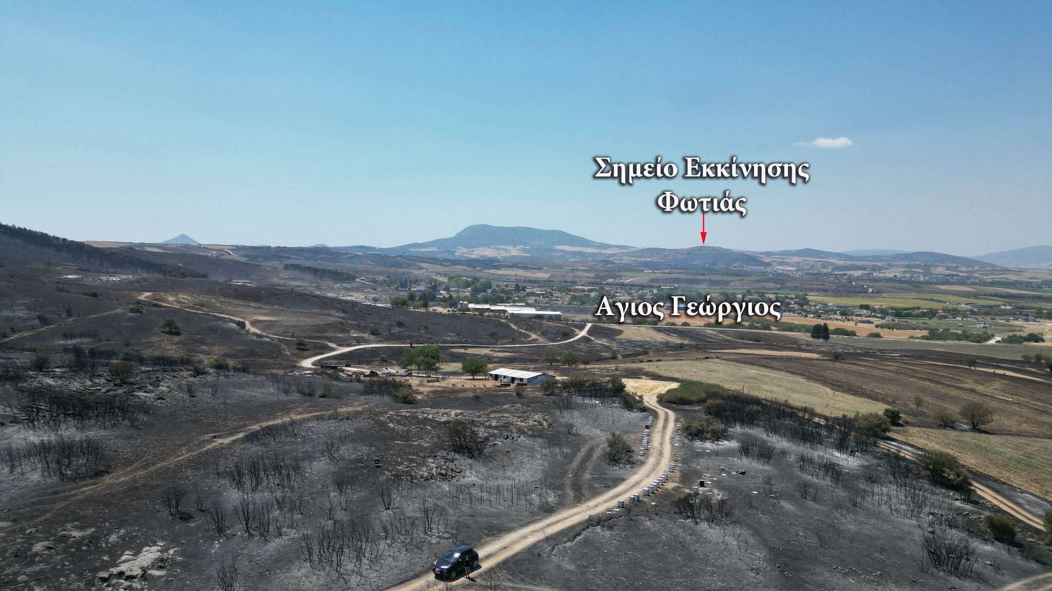 Η φωτιά ξεκίνησε από λόφο του Βελεστίνου (βέλος-φωτό). Από τις 13:15 μέχρι τις 14:30 η φωτιά λόγω ισχυρού δυτικού ανέμου έφθασε στον Άγιο Γεώργιο διανύοντας 5 χλμ. σε μία ώρα. Η πυροσβεστική επειδή δεν είχε αρκετή δύναμη επέλεξε να προστατέψει το χωριό και άφησε τις κτηνοτροφικές μονάδες που έχουν καεί ολοσχερώς (μαρτυρία κατοίκων και αυτοψία).