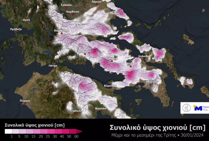 Εκτιμώμενο αθροιστικό ύψος χιονιού στα ανατολικά ηπειρωτικά μέχρι τις μεσημεριανές ώρες της Τρίτης 30/01, όπως υπολογίζεται από το αριθμητικό μοντέλο πρόγνωσης καιρού του meteo.gr / Εθνικού Αστεροσκοπείου Αθηνών.