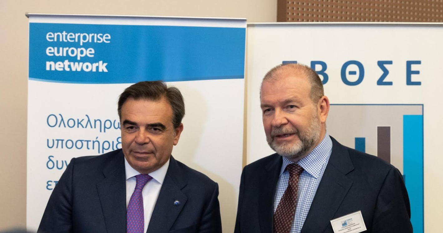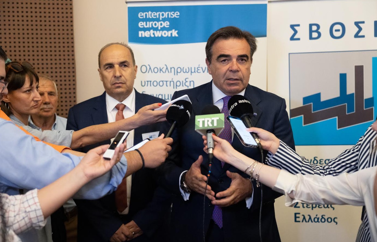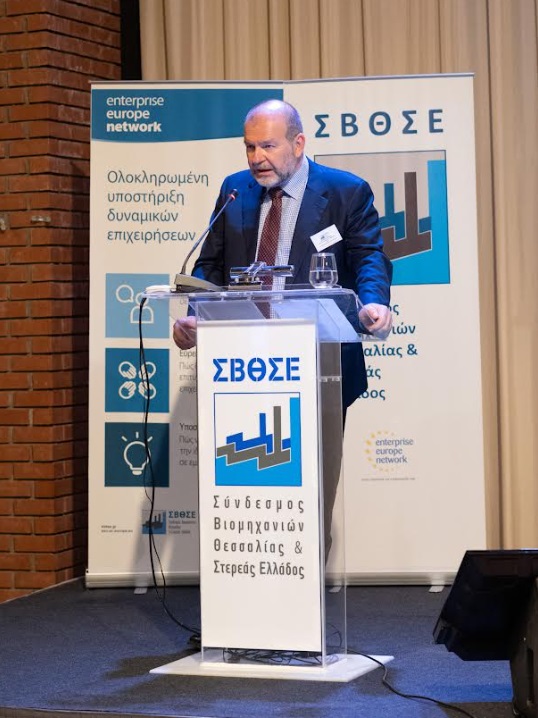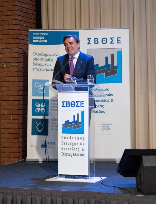Λαμβάνοντας τον λόγο, ο κ. Μαργαρίτης Σχοινάς, Αντιπρόεδρος της Ευρωπαϊκής Επιτροπής αρμόδιος για την Προώθηση του Ευρωπαϊκού Τρόπου Ζωής, αφού ευχαρίστησε τον Σύνδεσμο Βιομηχανιών Θεσσαλίας & Στερεάς Ελλάδος για την τιμητική πρόσκληση και όλους τους συμμετέχοντες για την παρουσία τους, αναφέρθηκε στις πρωτοβουλίες της Ευρωπαϊκής Ένωσης για την προώθηση της ανταγωνιστικότητας της Ευρωπαϊκής οικονομίας και της περιφερειακής ανάπτυξης σε ένα περίπλοκο διεθνές οικονομικό και γεωπολιτικό περιβάλλον.