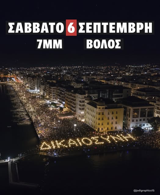 Οι Ενεργοί Πολίτες Βόλου καλούν τους πολίτες σήμερα στην παραλία του Βόλου στις 19:00 για να απαιτήσουν δικαιοσύνη. Όπως τονίζεται σε σχετική ανακοίνωση « Η πατρίδα μας δεν μπορεί να κάνει ούτε ένα βήμα μπροστά αν δεν αποδοθεί δικαιοσύνη στην υπόθεση των Τεμπών και όχι μόνο.
