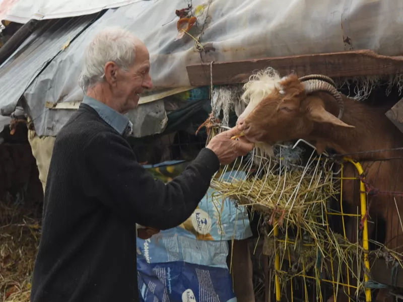 Κι όμως, μέσα σε όλες αυτές τις δυσκολίες, εκείνος συνεχίζει με το ίδιο ζεστό χαμόγελο, παρέα με τα σκυλάκια και τις κατσικούλες του.