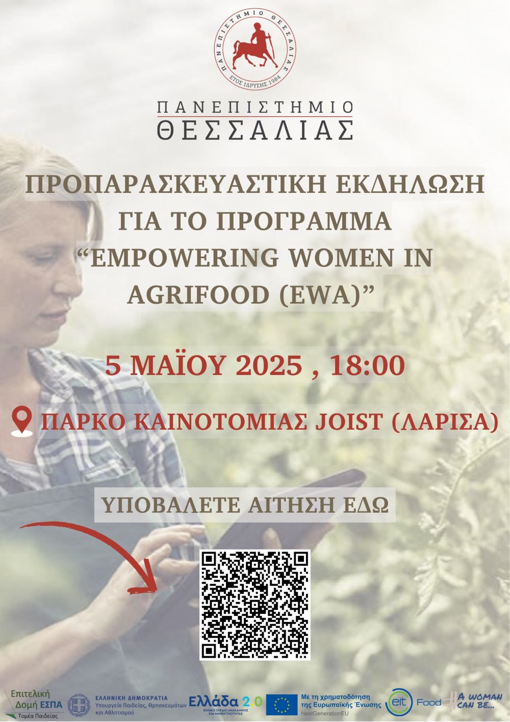 Το Πανεπιστήμιο Θεσσαλίας, για να περιγράψει το σκεπτικό του προγράμματος και να προετοιμάσει τις γυναίκες που θα υποβάλλουν αίτηση στο πρόγραμμα με στόχο να διακριθούν, διοργανώνει ενημερωτική εκδήλωση τη Δευτέρα 5 Μαΐου, στις 18.00, στο Πάρκο Καινοτομίας JOIST στη Λάρισα. Οι ενδιαφερόμενες θα ενημερωθούν αναλυτικά για τις προϋποθέσεις συμμετοχής, τα οφέλη του προγράμματος και τη διαδικασία αίτησης, θα συζητήσουν τις επιλογές τους, ενώ θα έχουν την ευκαιρία να συνομιλήσουν με ειδικούς και αποφοίτους προηγούμενων κύκλων του EWA.Η συμμετοχή είναι δωρεάν και απευθύνεται σε γυναίκες άνω των 18 ετών.