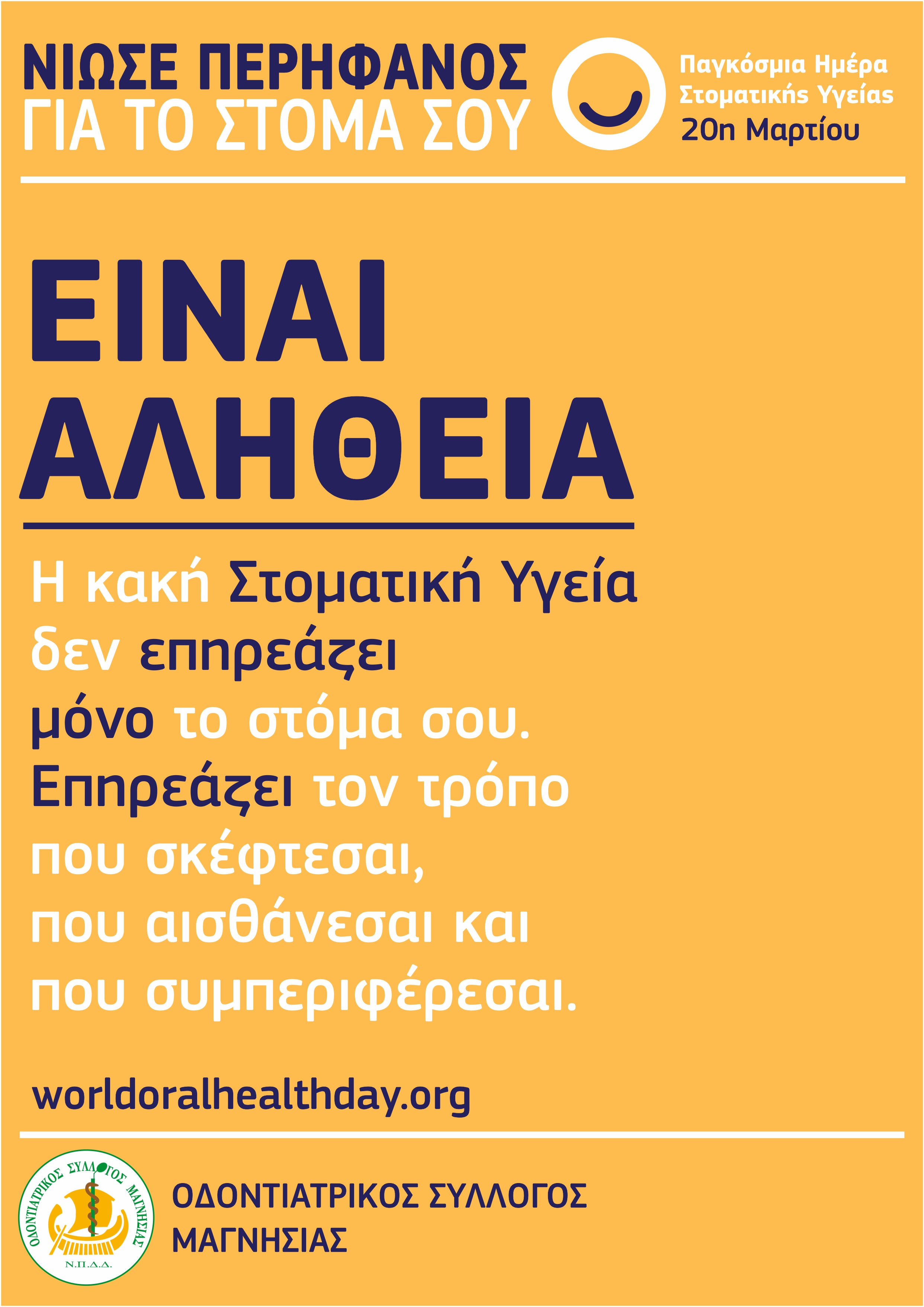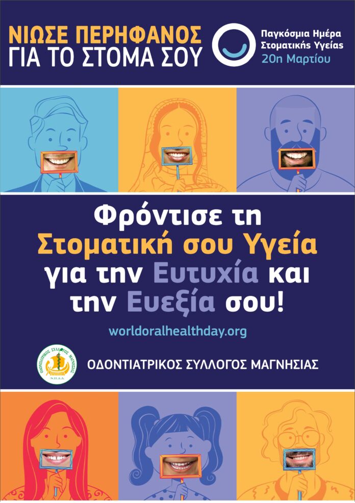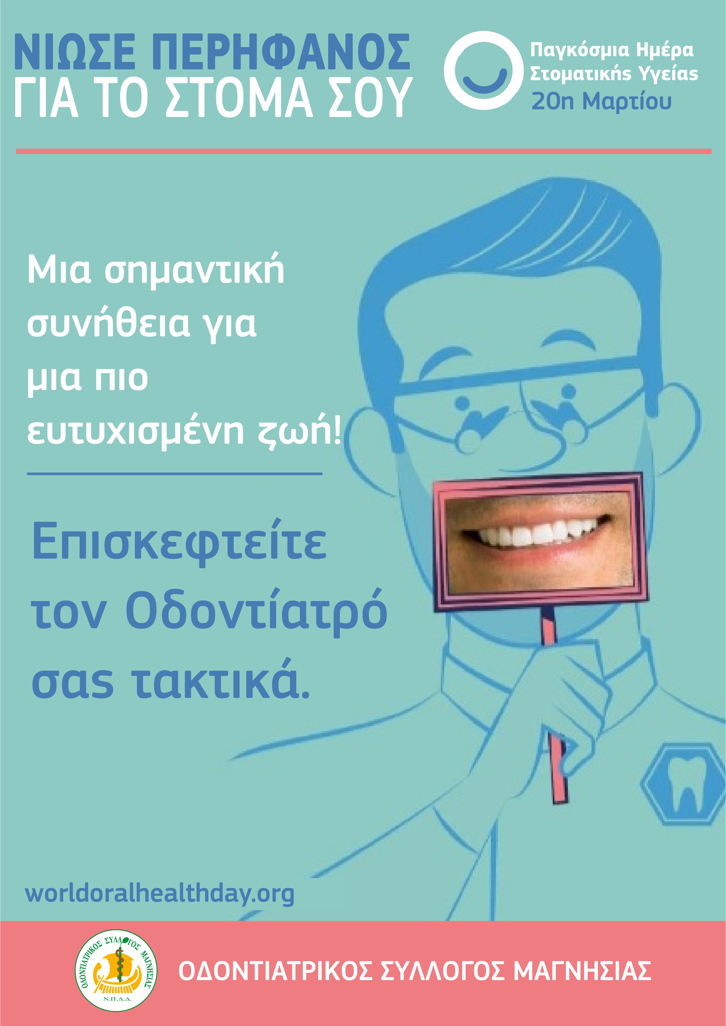 Την Κυριακή 20 Μαρτίου είναι η Παγκόσμια Ημέρα Στοματικής Υγιεινής και ο Οδοντιατρικός Σύλλογος μέσω σχετικής ανακοίνωσης στέλνει το μήνυμα ότι «το στόμα μας είναι ένας πραγματικός καθρέπτης της υγείας μας, καθώς αρκετά νοσήματα μπορούν να διαγνωστούν με μια προληπτική εξέταση». Με αφορμή την Παγκόσμια Ημέρα, από την 21η Μαρτίου έως την 31η Μαρτίου θα διενεργούνται δωρεάν προληπτικοί έλεγχοι μόνο κατόπιν συνεννόησης, λόγω των πρωτοκόλλων Covid -19. Επίσης, ο Οδοντιατρικός Σύλλογος Μαγνησίας δημιούργησε ψηφιακά μηνύματα εμπνευσμένα από την Παγκόσμια Οδοντιατρική Ομοσπονδία, ενώ γίνονται ενημερώσεις με τα μέσα μαζικής ενημέρωσης.