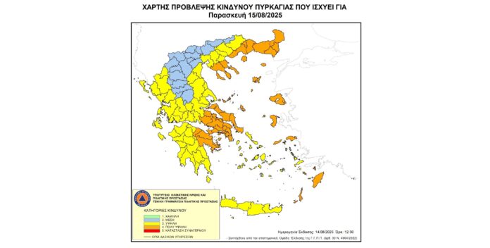 Σύμφωνα με τον Ημερήσιο Χάρτη Πρόβλεψης Κινδύνου Πυρκαγιάς της Γενικής Γραμματείας Πολιτικής Προστασίας, για την Παρασκευή 15 Αυγούστου 2025, προβλέπεται Κατηγορία Κινδύνου 4 (πολύ υψηλή) για τα νησιά των Β. Σποράδων και Κατηγορία Κινδύνου 3 (υψηλή) για την ηπειρωτική Μαγνησία, με την ΠΕ Μαγνησίας να διατηρείται σε εγρήγορεση.