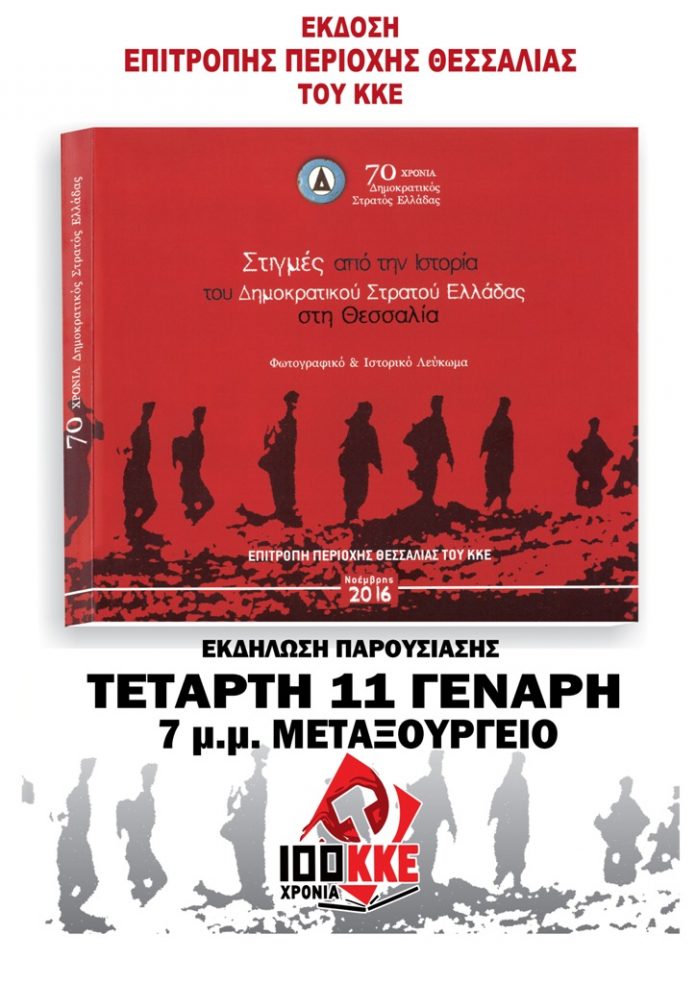 Η Επιτροπή Περιοχής Θεσσαλίας του ΚΚΕ εξέδωσε λεύκωμα με τίτλο «Στιγμές από την Ιστορία του ΔΣΕ στη Θεσσαλία» στο πλαίσιο «των προσπαθειών των Οργανώσεων του Κόμματος να διαδώσουν την ηρωική Ιστορία μας και τα διδάγματά της σε όσο το δυνατό περισσότερους εργατοϋπαλλήλους, νέους και νέες, φτωχούς αγρότες και επαγγελματίες, γυναίκες του λαού μας», όπως αναφέρεται από την Τομεακή Επιτροπή Βόλου.