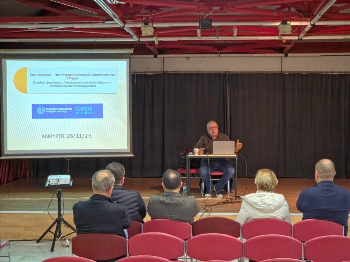 Παρουσία μελών της εμπορικής και επαγγελματικής κοινότητας του Αλμυρού πραγματοποιήθηκε το απόγευμα της Τετάρτης 26 Νοεμβρίου η ενημερωτική εκδήλωση με θέμα «Η νέα ψηφιακή πλατφόρμα ΟΠΣ Άσκησης Δραστηριοτήτων και Ελέγχων- Open Business: Εργαλείο Διαφάνειας, Απλούστευσης και Ανάπτυξης για τη Μεταποίηση και το Χονδρεμπόριο», όπως επισημαίνεται σε ανακοίνωση που εξέδωσε το Επιμελητήριο Μαγνησίας.