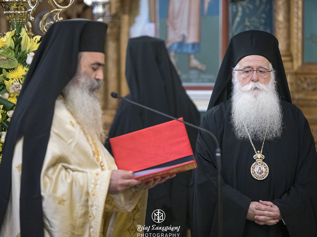 Κατακλείοντας τον λόγο του ο Παναγιώτατος εξέφρασε τον δίκαιο έπαινο της Μητρός Εκκλησίας προς τον Σεβ. Μητροπολίτη μας κ. Ιγνάτιο, «για το πολυσχιδές, ποιμαντικόν, Θεολογικόν και κοινωνικόν έργον, το οποίον, μετά ζήλου ενθέου και επιτυχίας πολλής επιτελεί εις την Θεόσωστον επαρχίαν του». Προσέφερε δε στο Σεβ. Ποιμενάρχη μας Ποιμαντορική Ράβδο, ως αντίδωρο της πολλής προς το Φανάρι και το Πατριαρχείο μας. Στον δε Προϊστάμενο του Ναού προσέφερε ένα αργυρό θυμιατό, εις διαρκή ευλογία.