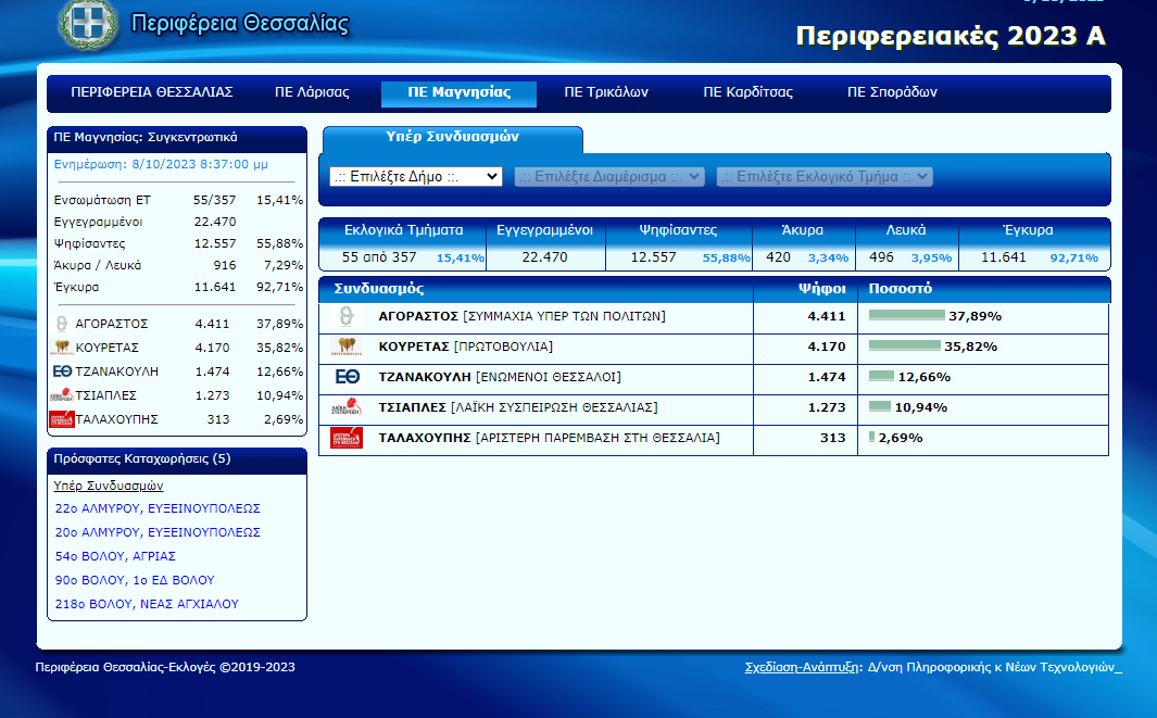 Συνεχίζεται η μάχη των ψήφων στις περιφερειακές εκλογές με τον Κ. Αγοραστό να περνά μπροστά στην ΠΕ Μαγνησίας σε 55 από τα 357 εκλογικά τμήματα. Ωστόσο ο Δ. Κουρέτας είναι σε απόσταση αναπνοής με την “μάχη” των δύο να εξελίσσεται.