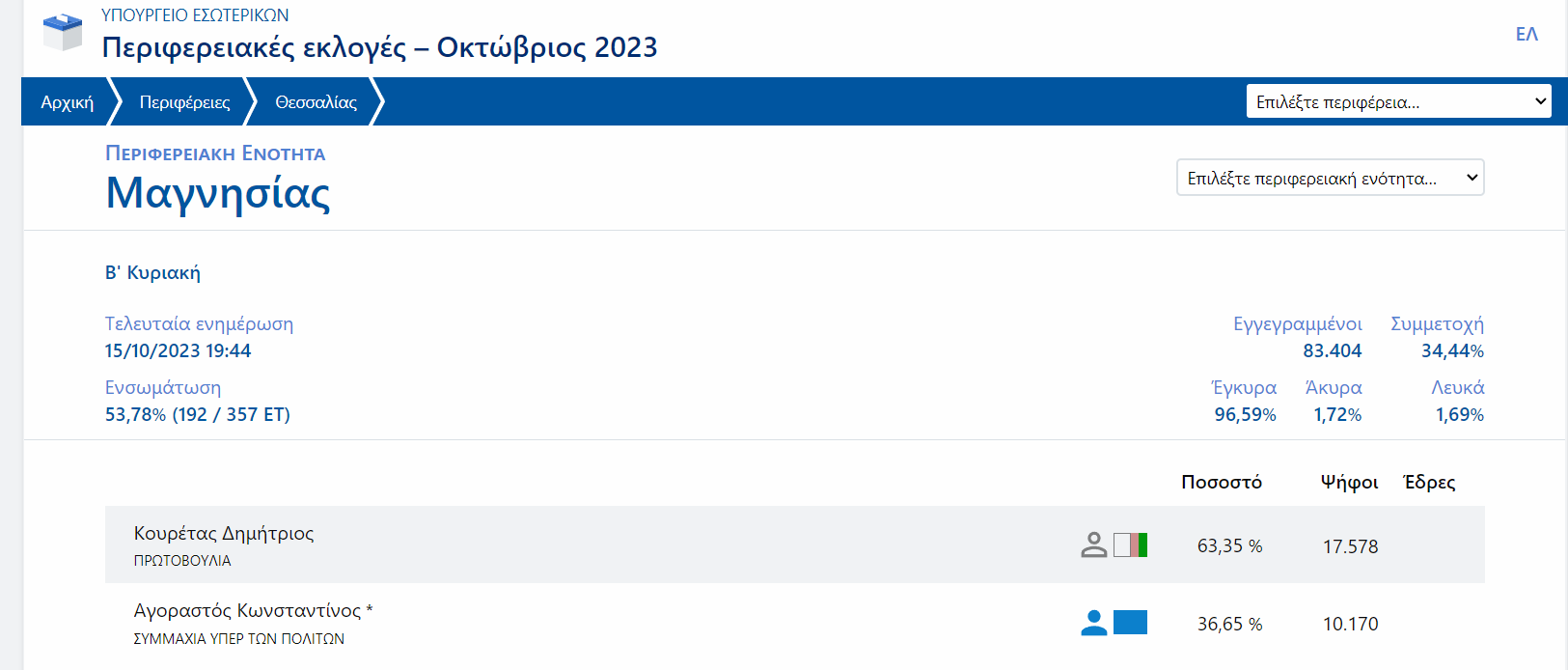 Πρωτιά στον Δ. Κουρέτα δίνει η ΠΕ Μαγνησίας στο 53,78% της ενσωμάτωσης. Ο Δημήτρης Κουρέτας λαμβάνει 63.35% και ο Κώστας Αγοραστός 36, 65%