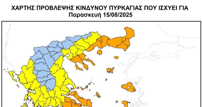 Όπως προβλέπεται με τον Ημερήσιο Χάρτη Πρόβλεψης Κινδύνου Πυρκαγιάς της Γενικής Γραμματείας Πολιτικής Προστασίας, στην Περιφέρεια Θεσσαλίας, για σήμερα, Παρασκευή 15 Αυγούστου , προβλέπεται Κατηγορία Κινδύνου 3 (υψηλή) για για την Π.Ε. Λάρισας και για την Π.Ε. Μαγνησίας και Κατηγορία Κινδύνου 4 (πολύ υψηλή) για τις Σποράδες.
