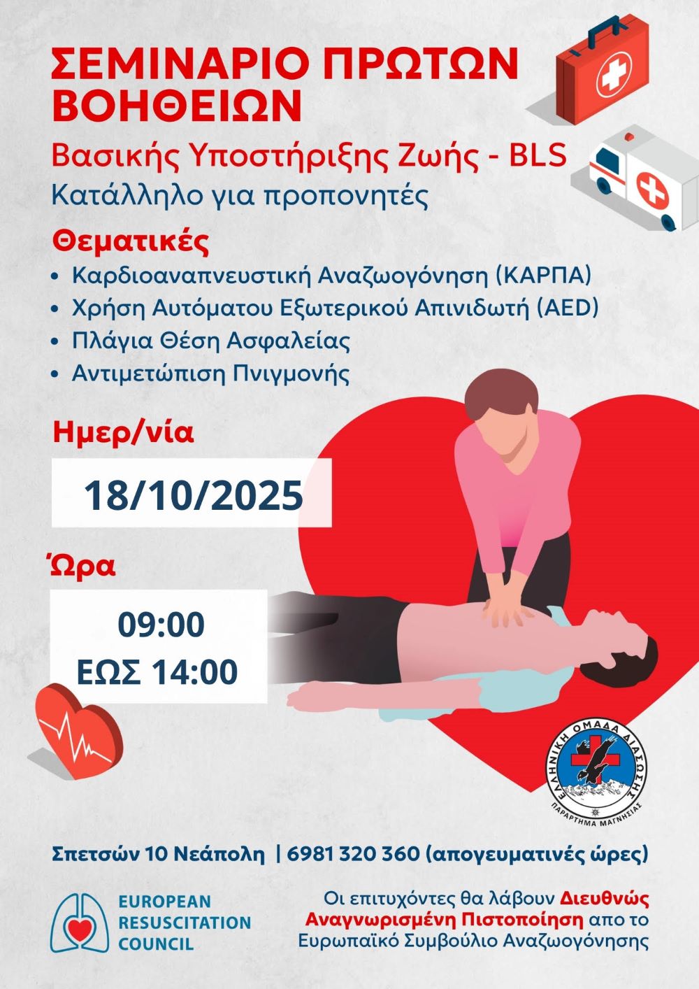 Η Ελληνική Ομάδα Διάσωσης Μαγνησίας διοργανώνει το Σάββατο 18 Οκτωβρίου 2025, από 09:00 έως 14:00, πιστοποιημένο Σεμινάριο Πρώτων Βοηθειών – Βασικής Υποστήριξης Ζωής (BLS), διάρκειας πέντε ωρών, υπό την αιγίδα του Ευρωπαϊκού Συμβουλίου Αναζωογόνησης (ERC).