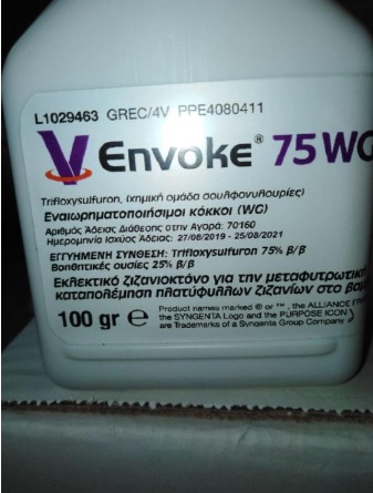 Η Διεύθυνση Αγροτικής Οικονομίας των Π.Ε. Μαγνησίας και Σποράδων ενημερώνει τους επαγγελματίες χρήστες φυτοπροστατευτικών προϊόντων ότι διαπιστώθηκε η διάθεση στην Ελληνική αγορά μη εγκεκριμένου (πλαστού) φυτοπροστατευτικού προϊόντος με το όνομα «ENVOKE 75WG», που φέρει πλαστή Ελληνική ετικέτα. Το προϊόν δεν έχει λάβει κατά παρέκκλιση άδεια διάθεσης στην αγορά, παρόλα αυτά στην ετικέτα του σκευάσματος αναφέρεται ότι έχει δήθεν «Ημερομηνία Ισχύος Άδειας: 27/08/2019 – 25/08/2021», το οποίο δεν ανταποκρίνεται στην πραγματικότητα. Το εν λόγω σκεύασμα είναι μη εγκεκριμένο, αγνώστου σύστασης.