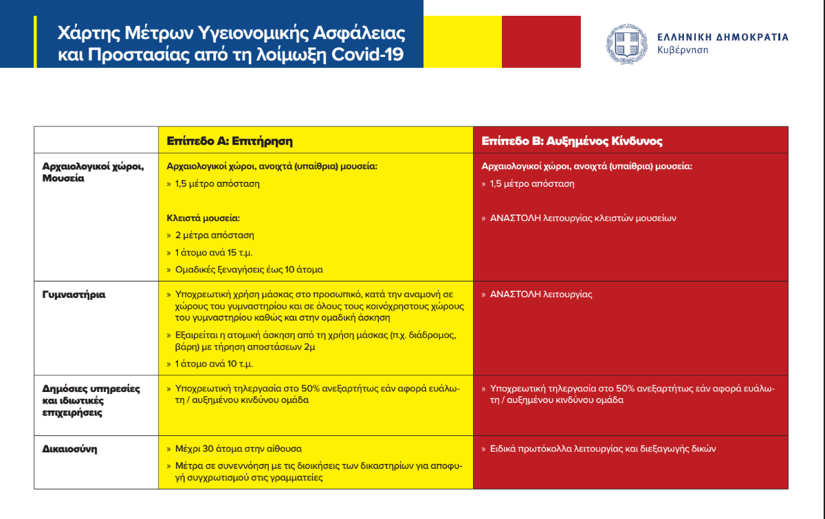 Στο επίπεδο Β (κόκκινο), η λειτουργία των κλειστών μουσείων αναστέλλεται.