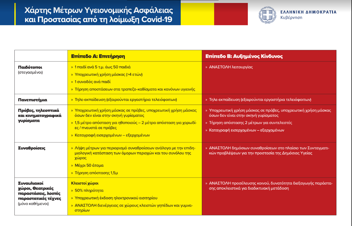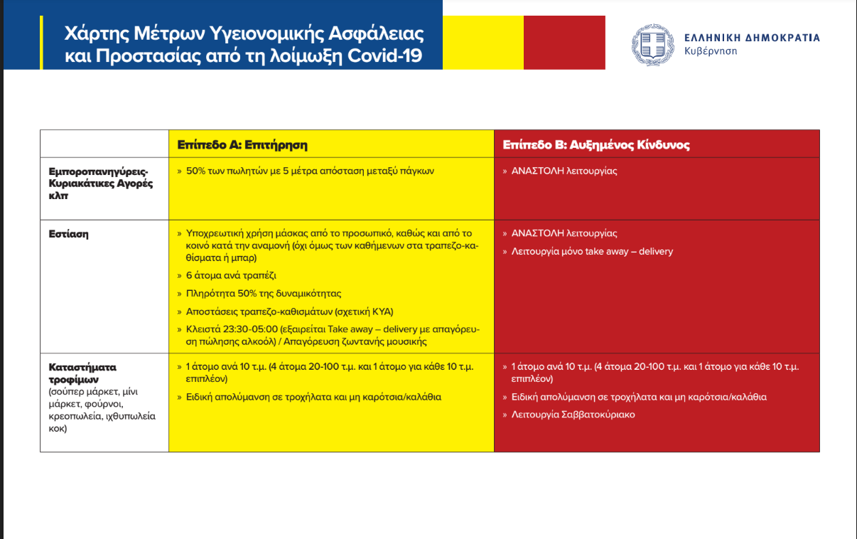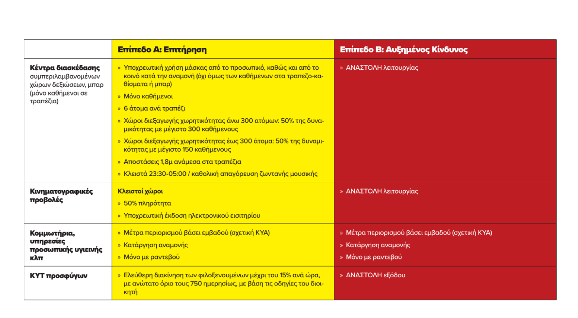 Στο επίπεδο Β’ (κόκκινο) προβλέπεται πλήρης αναστολή λειτουργίας, με εξαίρεση το take away και το delivery.