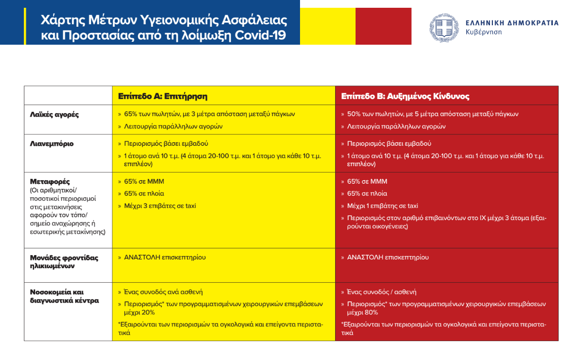 Προβλέπεται ένας συνοδός ανά ασθενή και περιορισμός των προγραμματισμένων χειρουργικών επεμβάσεων μέχρι 20% στο επίπεδο Α (κίτρινο) και μέχρι 80% στο επίπεδο Β (κόκκινο).