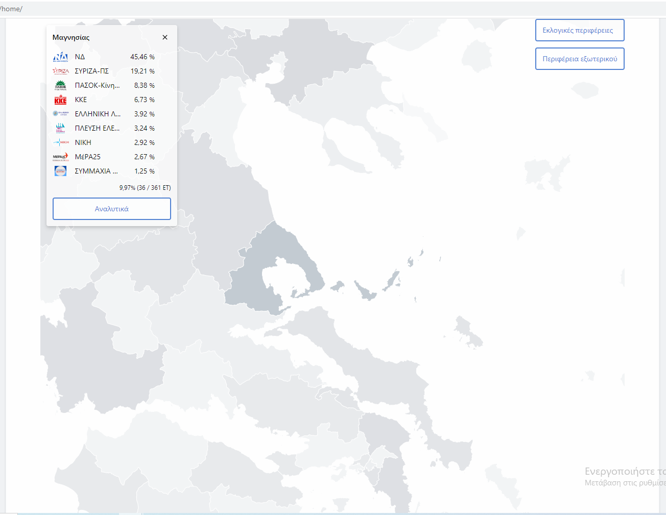 Τα αποτελέσματα στη Μαγνησία για το 10% περίπου των κομμάτων δίνει το Υπουργείο Εσωτερικών, με τη ΝΔ. να διατηρείται σταθερά.