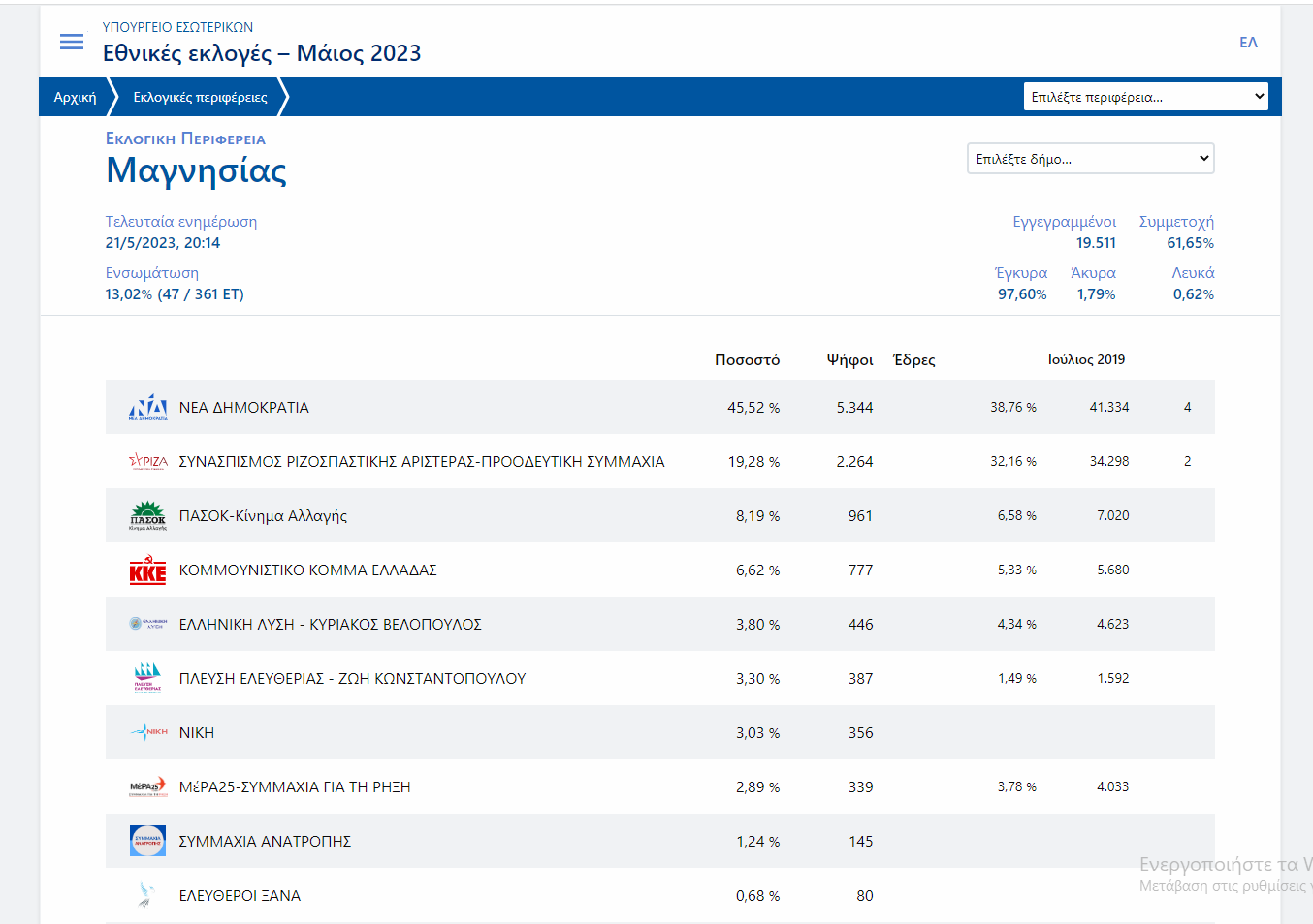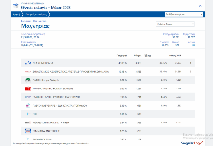 Τα ποσοστά αλλά και τις ψήφους που έλαβαν τα κόμματα στη Μαγνησία στο περίπου 20% των τμημάτων στο νομό, γνωστοποίησε το Υπουργείο Εσωτερικών. Σύμφωνα με αυτό η ΝΔ. προηγείται σταθερά.