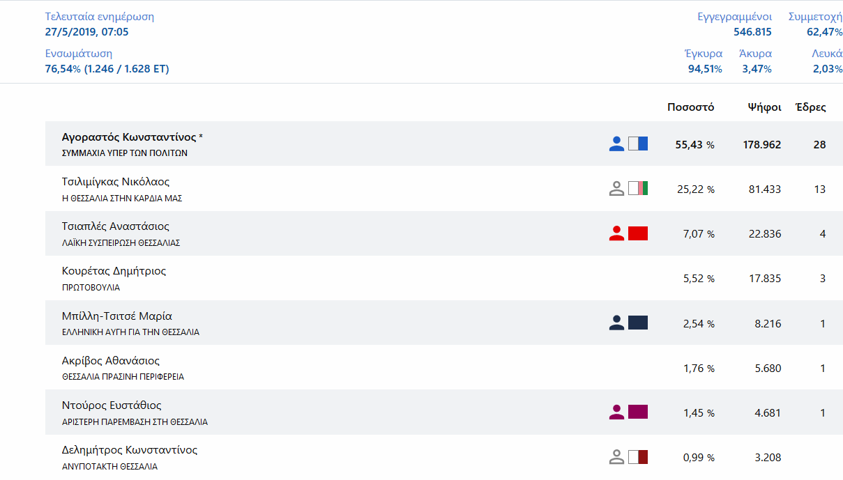 Σύμφωνα με τα επίσημα αποτελέσματα του Υπουργείου Εσωτερικών η εικόνα στην Περιφέρεια Θεσσαλίας έχει ως εξής: