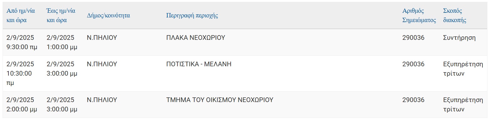 Αν οι εργασίες τελειώσουν νωρίτερα, το ρεύμα θα ξαναδοθεί πριν το χρόνο λήξης της διακοπής που αναφέρεται πιο πάνω.