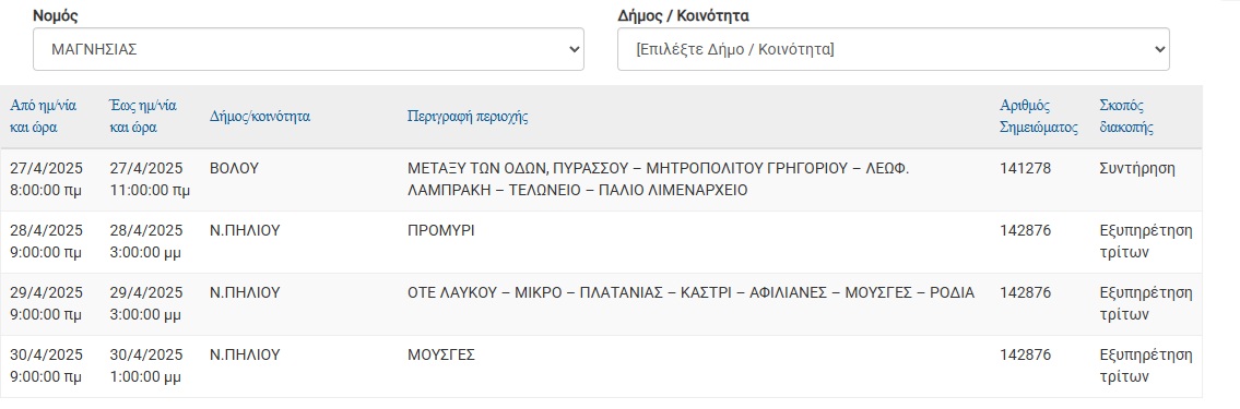 Διακοπές ηλεκτρικού ρεύματος θα σημειωθούν σε περιοχές της Μαγνησίας προκειμένου να εκτελεστούν απαραίτητες τεχνικές εργασίες του ΔΕΔΔΗΕ.