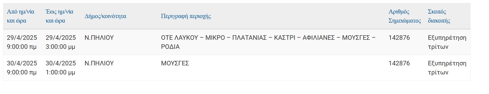 Αν οι εργασίες τελειώσουν νωρίτερα, το ρεύμα θα ξαναδοθεί πριν το χρόνο λήξης της διακοπής που αναφέρεται πιο πάνω.