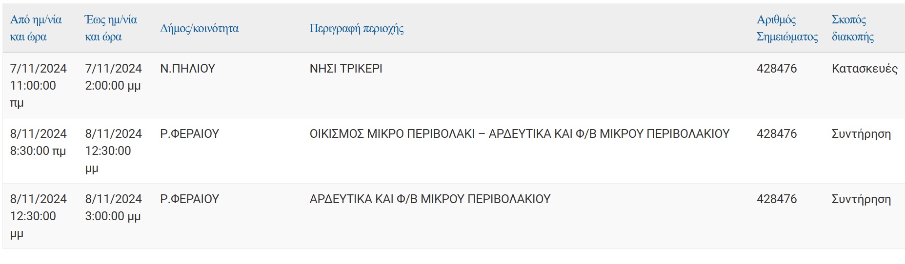Ειδοποιούνται οι κάτοικοι των παρακάτω περιοχών ότι, για να εκτελεσθούν οι απαραίτητες τεχνικές εργασίες της ΔΕΔΔΗΕ, θα γίνει διακοπή του ηλεκτρικού ρεύματος:
