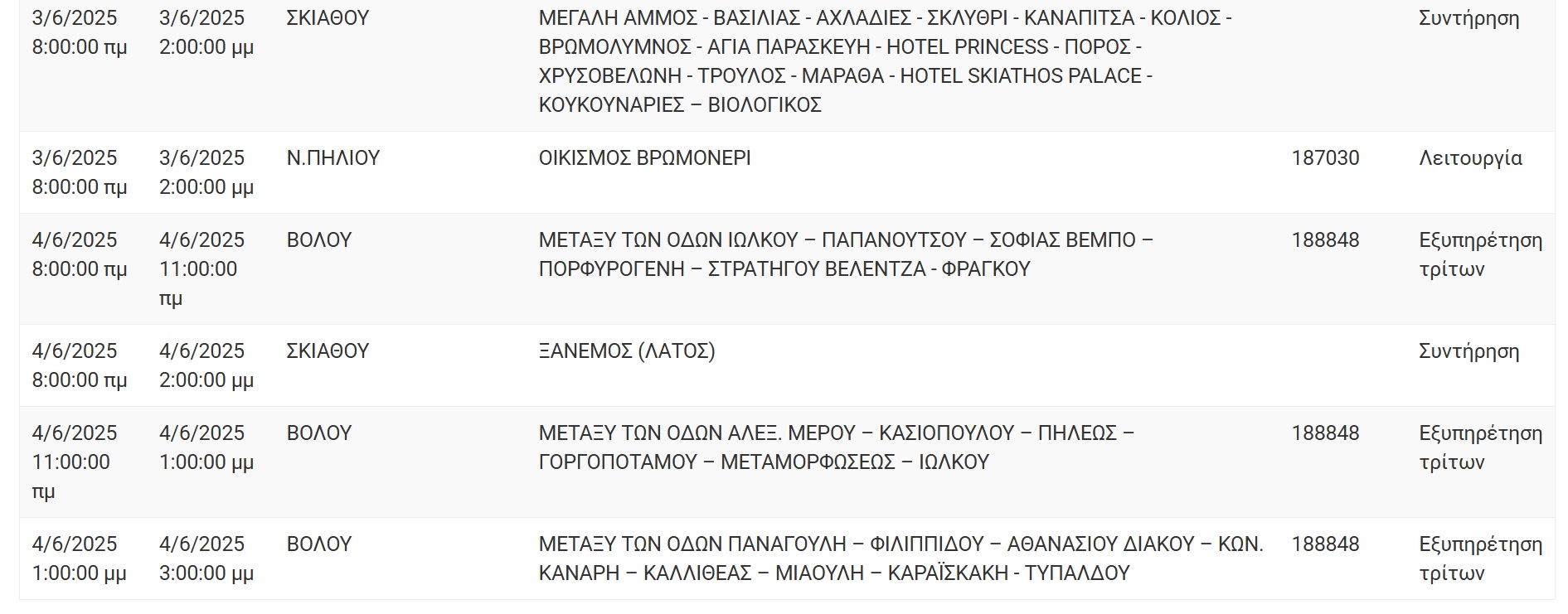 Διακοπές ηλεκτρικού ρεύματος θα σημειωθούν σε περιοχές του Βόλου και της Μαγνησίας προκειμένου να εκτελεστούν απαραίτητες τεχνικές εργασίες του ΔΕΔΔΗΕ. Ειδοποιούνται οι κάτοικοι της παρακάτω περιοχής ότι για να εκτελεσθούν οι απαραίτητες τεχνικές εργασίες της ΔΕΔΔΗΕ θα γίνει διακοπή του ηλεκτρικού ρεύματος: