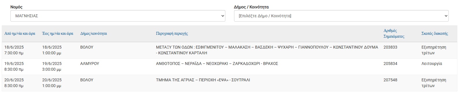 Διακοπές ηλεκτρικού ρεύματος θα σημειωθούν σε περιοχές του Βόλου και της Μαγνησίας προκειμένου να εκτελεστούν απαραίτητες τεχνικές εργασίες του ΔΕΔΔΗΕ.Ειδοποιούνται οι κάτοικοι της παρακάτω περιοχής ότι για να εκτελεσθούν οι απαραίτητες τεχνικές εργασίες της ΔΕΔΔΗΕ θα γίνει διακοπή του ηλεκτρικού ρεύματος: