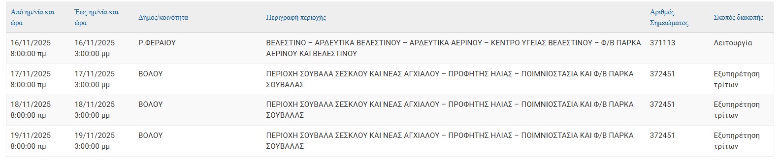 Πού θα γίνουν διακοπές ρεύματος στη Μαγνησία