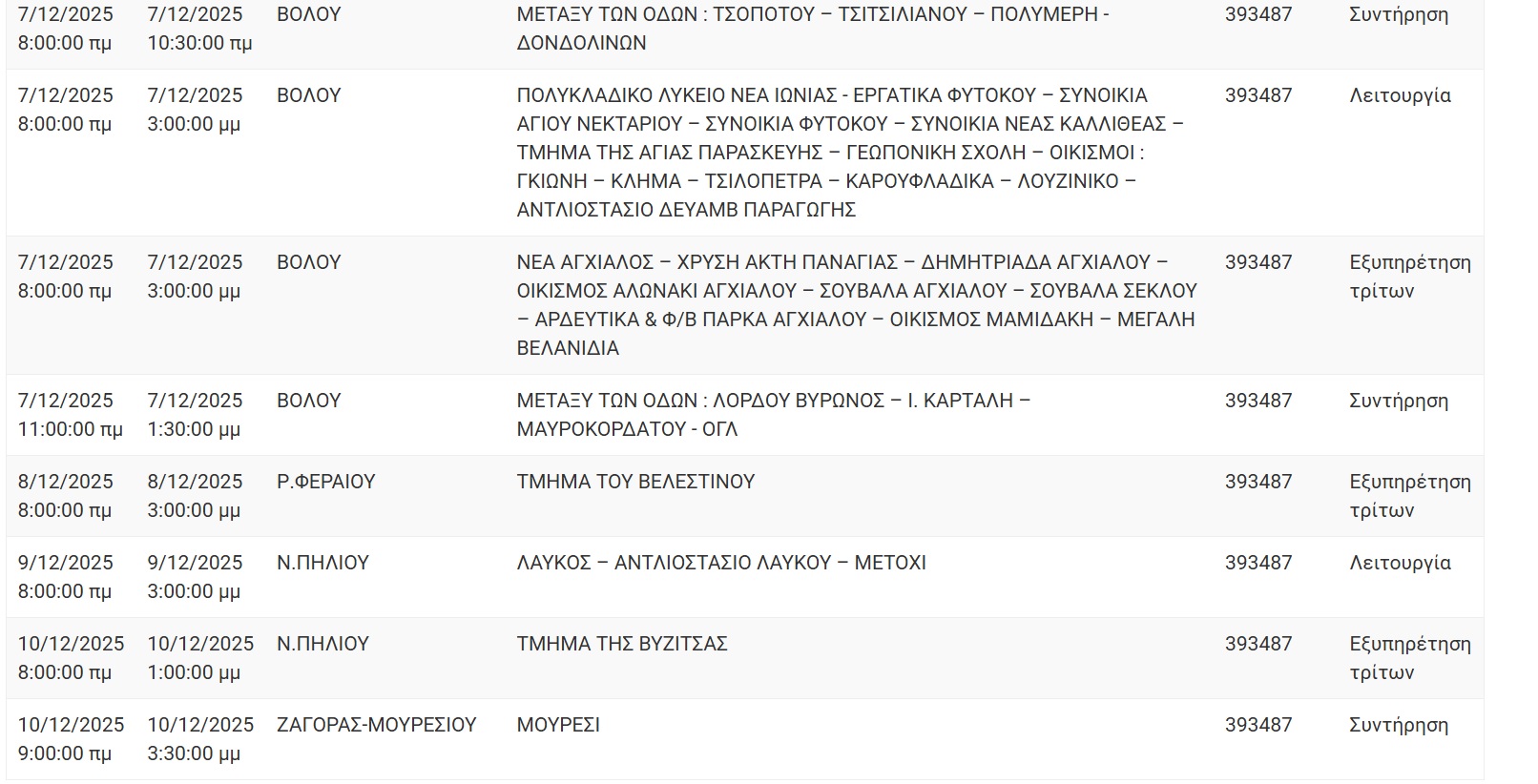 Διακοπές ηλεκτρικού ρεύματος θα σημειωθούν σε περιοχές του Βόλου και της Μαγνησίας προκειμένου να εκτελεστούν απαραίτητες τεχνικές εργασίες του ΔΕΔΔΗΕ.Ειδοποιούνται οι κάτοικοι της παρακάτω περιοχής ότι για να εκτελεσθούν οι απαραίτητες τεχνικές εργασίες της ΔΕΔΔΗΕ θα γίνει διακοπή του ηλεκτρικού ρεύματος:
