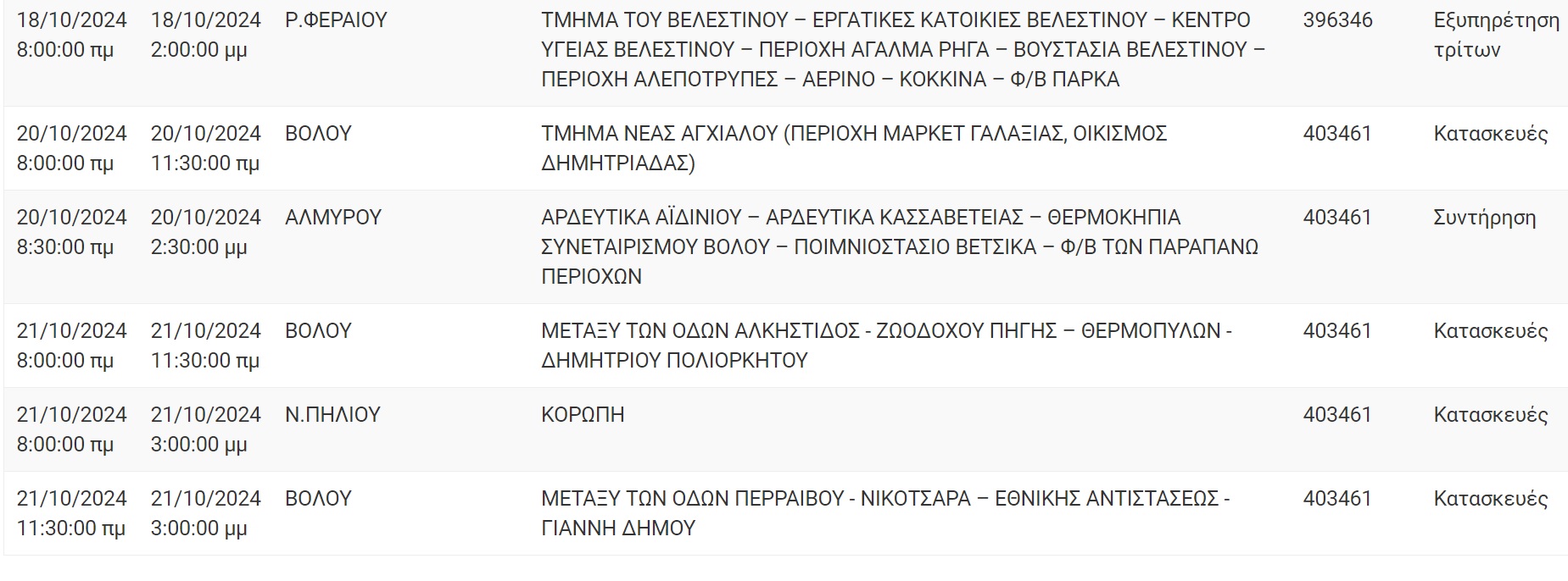 Διακοπές ηλεκτρικού ρεύματος θα σημειωθούν σε περιοχές της Μαγνησίας προκειμένου να εκτελεστούν απαραίτητες τεχνικές εργασίες του ΔΕΔΔΗΕ. Ειδοποιούνται οι κάτοικοι των παρακάτω περιοχών ότι για να εκτελεσθούν οι απαραίτητες τεχνικές εργασίες της ΔΕΔΔΗΕ θα γίνει διακοπή του ηλεκτρικού ρεύματος: